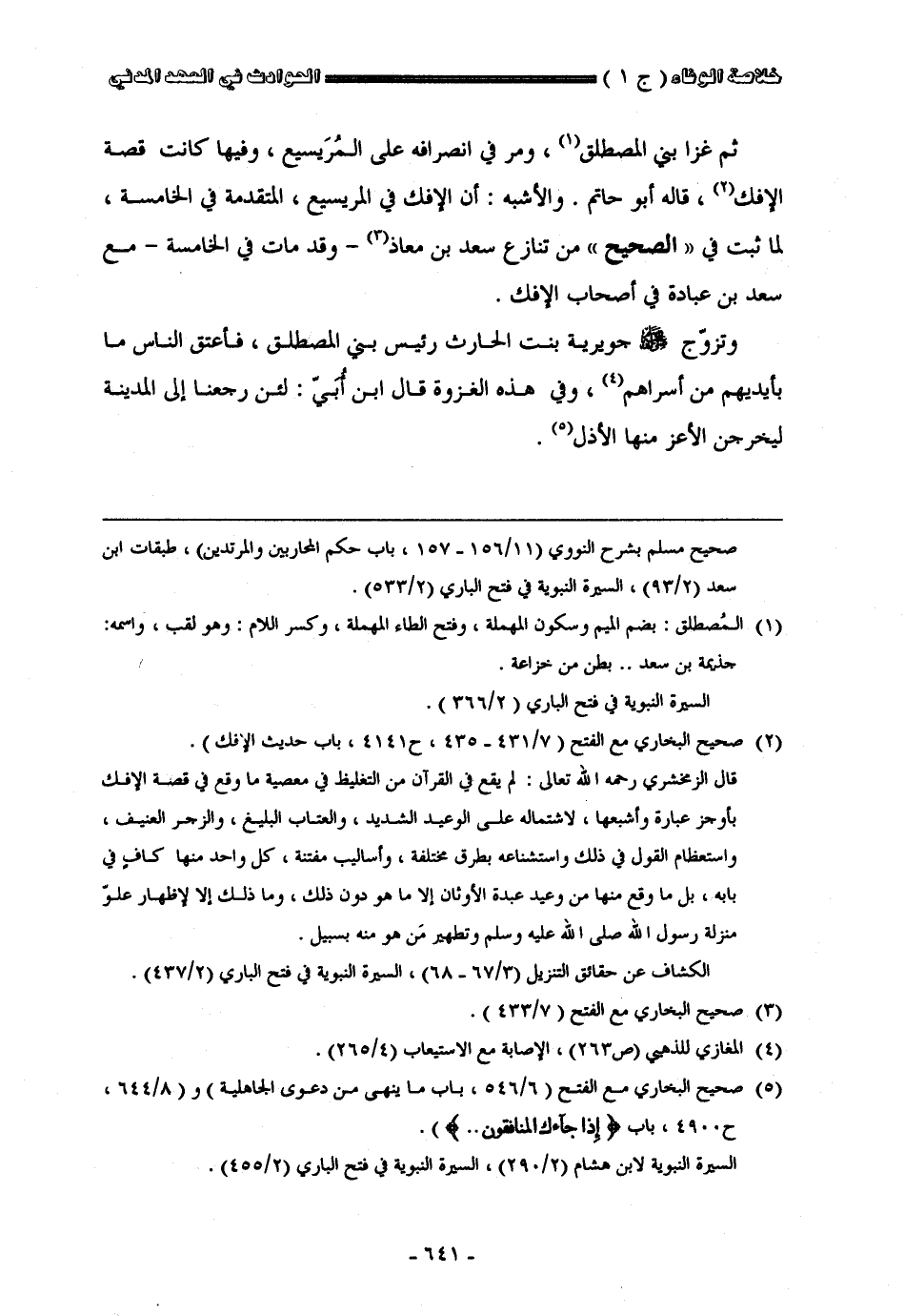 ثم غزا بني المصطلق ومّ في انصرافه على المريسيع وفيها كانت قصة الإفك قال أبو حاتم والأشبه أن الإفك في المريسيع المتقدمة في الخامسة لما ثبت في الصحيح من تنازع سعد بن معاذ وقدمات في الخامسة مع سعد بن عبادة في أصحاب الإفك وتزوج صلى الله عليه وسلم جورية بنت الحرث رئيس بني المطلق فأعتق الناس ما بأيديهم من أسراهم وفي هذه الغزوة قال ابن أبي لئن رجعنا إلى المدينة ليخرجن الأعز منها والأذل