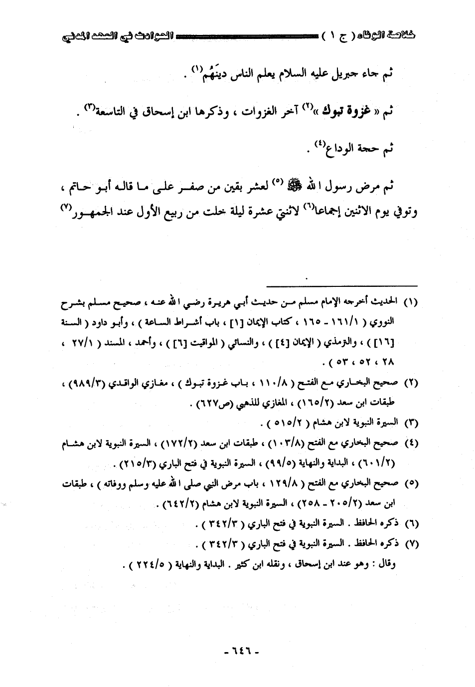 ثم جاء جبريل عليه السلام يعلم الناس دينهم ثم غزوة تبوك وهي آخر الغزوات وذكرها ابن إسحاق في التاسعة ثم حجة الوداع ثم مرض صلى الله عليه وسلم لعشر يقين من صفر على ما قاله أبو حاتم وتوفى يوم الاثنين إجماعا لاثنتى عشر ليلة خلت من ربيع الأول عند الجمهور