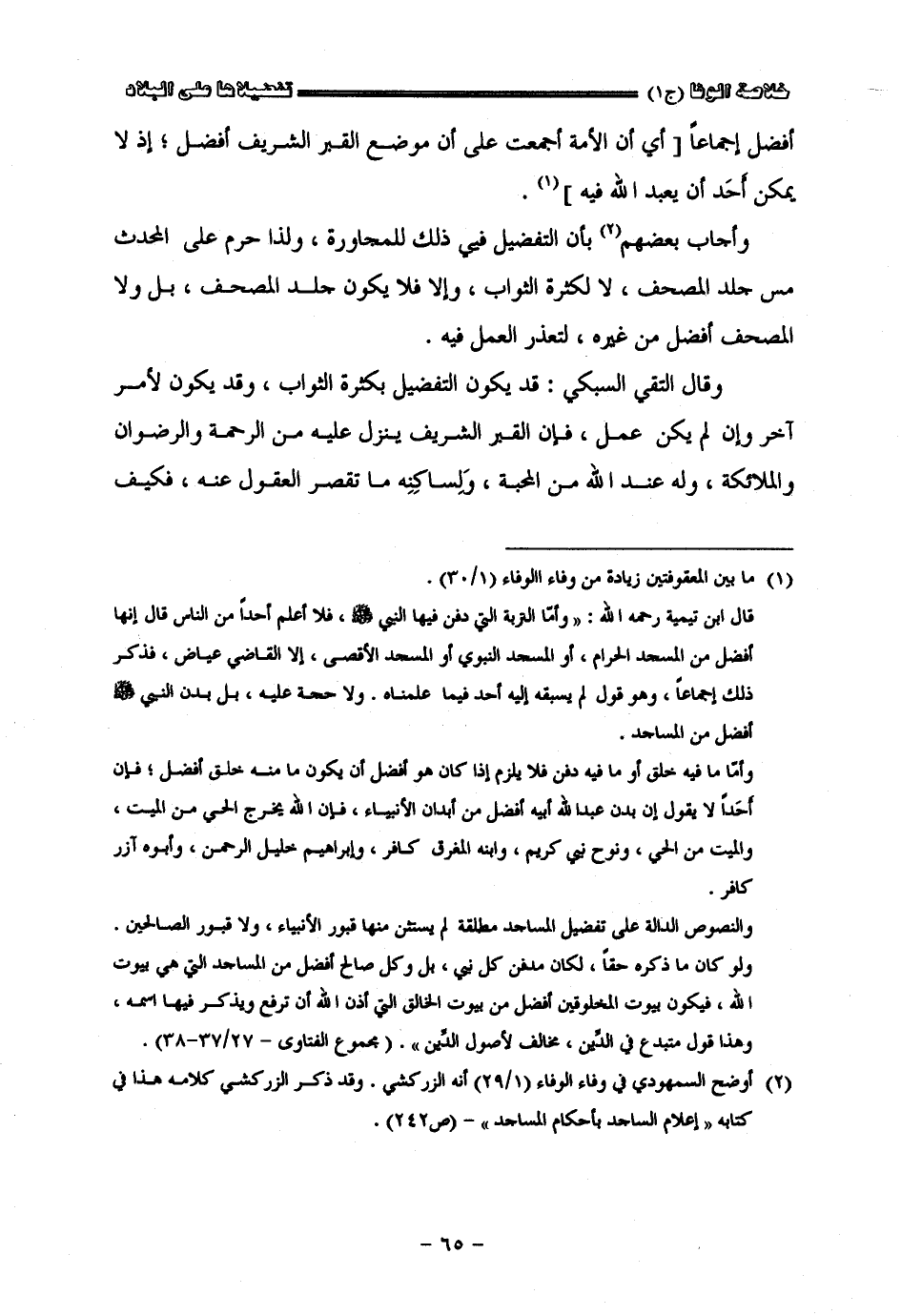 أفضل إجماعا وأجاب بعضهم بأن التفضيل في ذلك للمجاورة ولذا حرم على المحدث مس جلد المصحف لا لكثرة الثواب وإلا فلا يكون جلد المصحف بل ولا المصحف أفضل من غيره لتعذر العمل فيه وقال التقى السبكي قد يكون التفضيل بكثرة الثواب وقد يكون لأمر آخرون لم يكن عمل فأن القبر الشريف ينزل عليه من الرحمة والرضوان والملائكة وله عند الله من المحبة ولساكنه ما تقصر العقول عنه فكيف