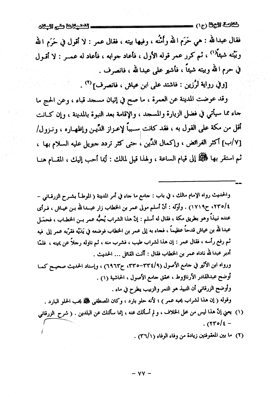 فقال عبد الله هي حرم الله وأمنه وفيها بيته فقال عمر لا أقول في حرم الله وبيته شيئاً ثم كرّر عمر قوله الأوّل فأعاد جوابه فأعاد له عمر لا أقول في حرم الله وبيته شيئاً فأشير على عبد الله فأنصرف وقد عوضت المدينة عن العمرة ما صح في إتيان مسجد قباء وعن الحج ما جاء مما سيأتي في فضل الزيارة والمسجد والإقامة بعد النبوّة بالمدينة وإن كانت أقل من مكة على القول به فقد كانت سببا لإعزاز الدين وإظهاره ونزول أكثر الفرائض وإكمال الدين حتى كثر تردّد جبريل عليه السلام بها ثم استقرّ بها صلى الله عليه وسلم إلى قيام الساعة ولهذا قيل لمالك أيما أحب إليك المقام هنا