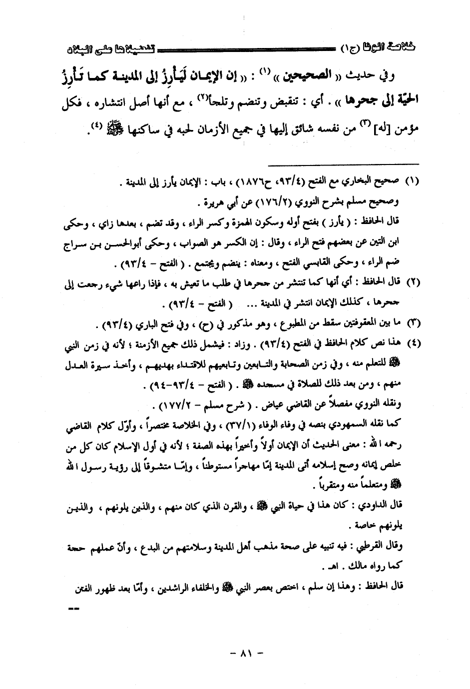وفي حديث الصحيحين إن الإيمان ليأرز إلى المدينة كما تأرز الحية إلى جحرها أي تنقبض وتنضم وتلجأ مع أنها أصل انتشاره فكل مؤمن من نفسه شائق إليها في جميع الأزمان لحبه في ساكنها صلى الله عليه وسلم