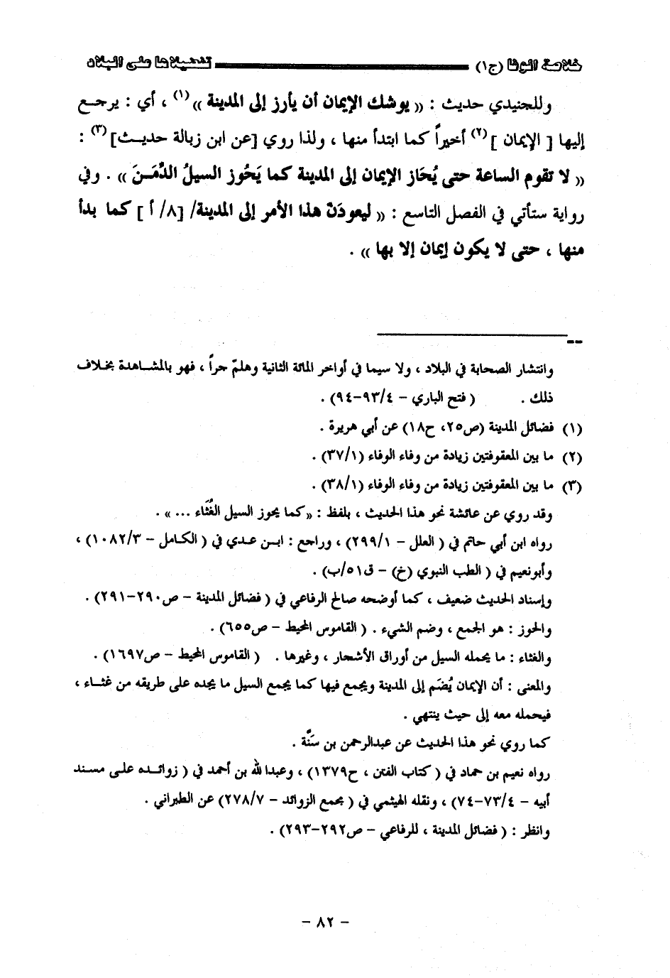 وللجنيدي حديث يوشك الإيمان أن يأرز إلى المدينة أي يرجع إليها أخيرا كما أبتدأ منها ولذا روى لا تقوم الساعة حتى يحاز الإيمان إلى المدينة كما يجوز السيل الدمن وفي رواية ستأتي في الفصل التاسع ليعودنَ هذا الأمر إلى المدينة كما بدئ منها حتى لا يكون إيمان إلا بها