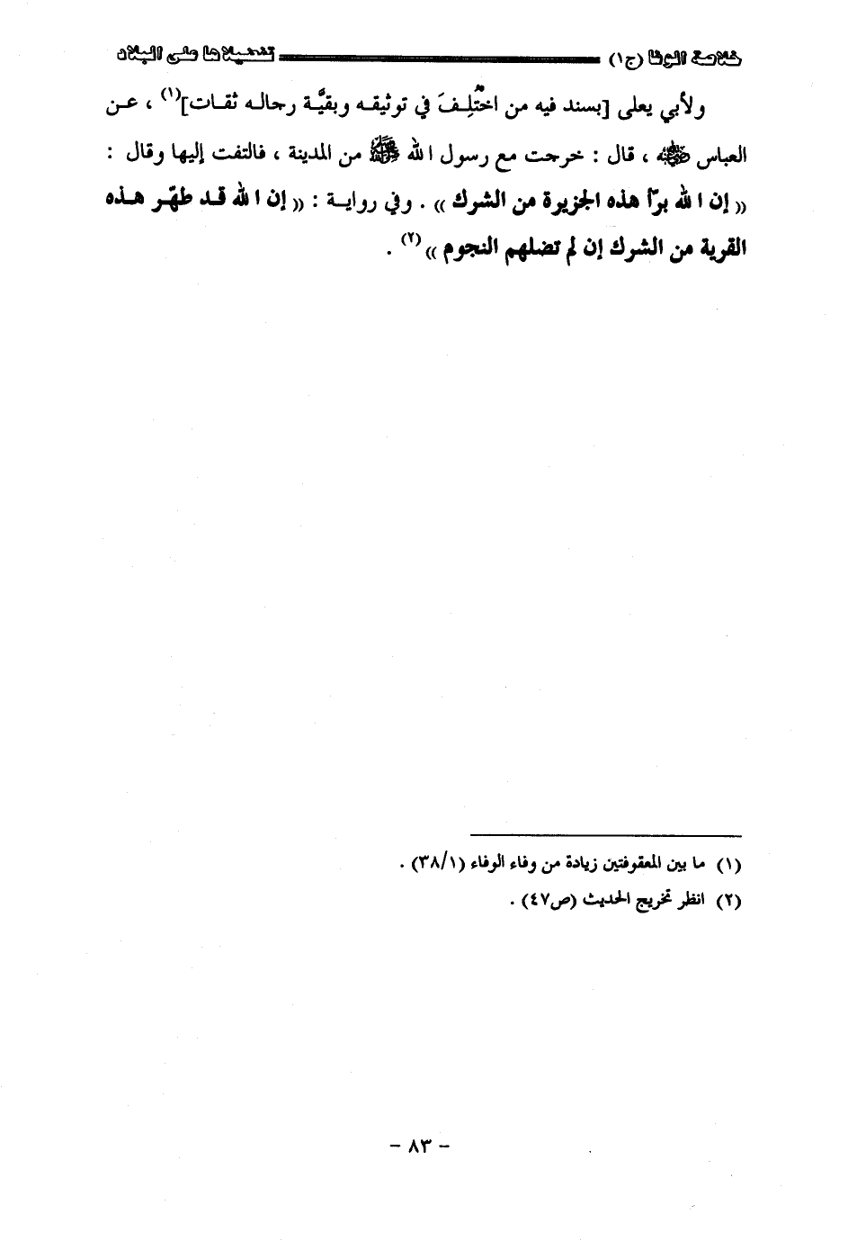 ولأبى يعلى عن العباس رضى الله عنه قال خرجت مع رسول الله صلى الله عليه وسلم من المدينة فالتفت إليها وقال إنّ الله برأ هذه الجزيرة من الشرك في رواية إنّ الله قد طهر هذه القرية من الشرك إن لم تضلهم النجوم