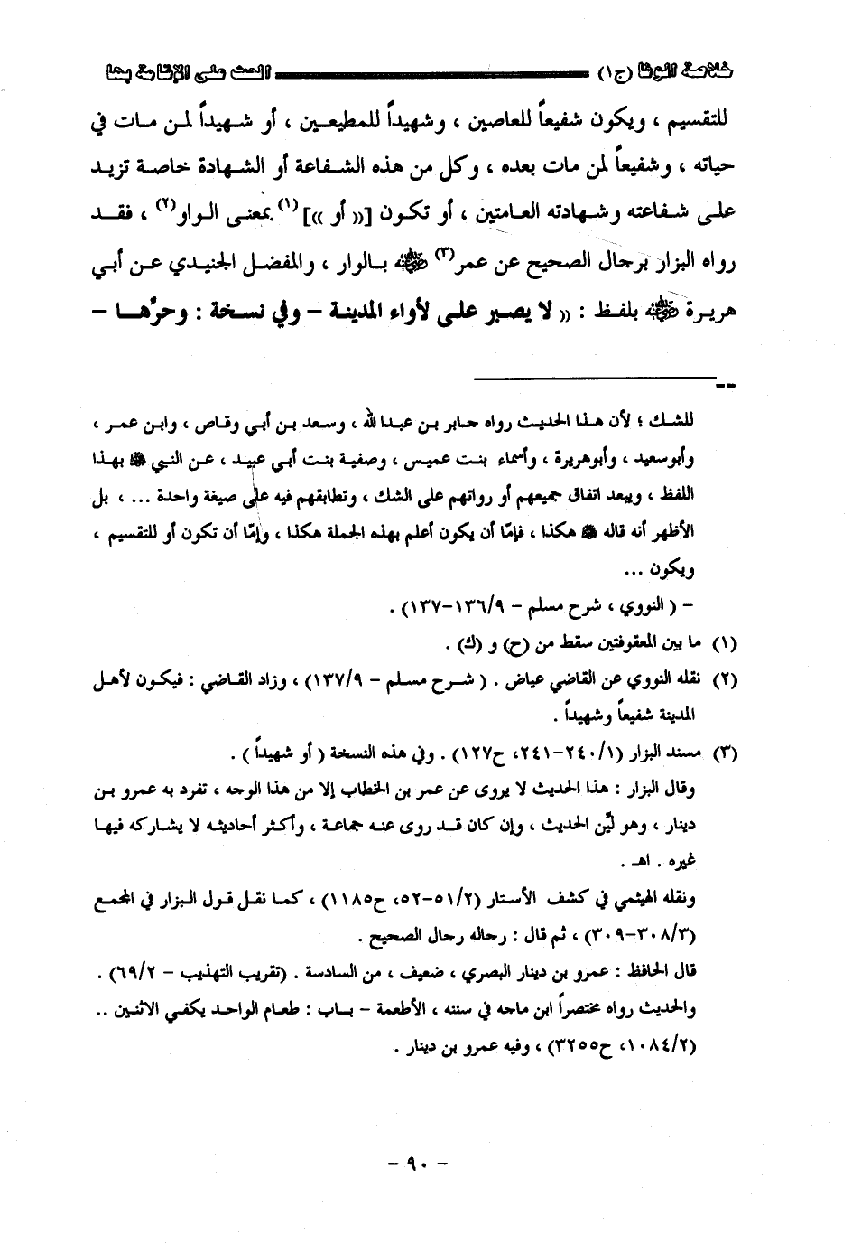 للتقسيم ويكون شفيعا للعاصين وشهيدا للمطيعين أو شهيدا لمن مات في حياته وشفيعا لمن مات بعده وكل من هذه الشفاعة أو الشهادة خاصة تزيد على شفاعته وشهادته العامتين أو تكون أو بمعنى الواو فقد رواه البزار برجال الصحيح عن عمر رضى الله عنه بالواو والمفضل الجنيدي عن أبي هريرة رضى الله عنه بلفظ لا يصبر أحد على لأواء المدينة وفي نسخة وحرها