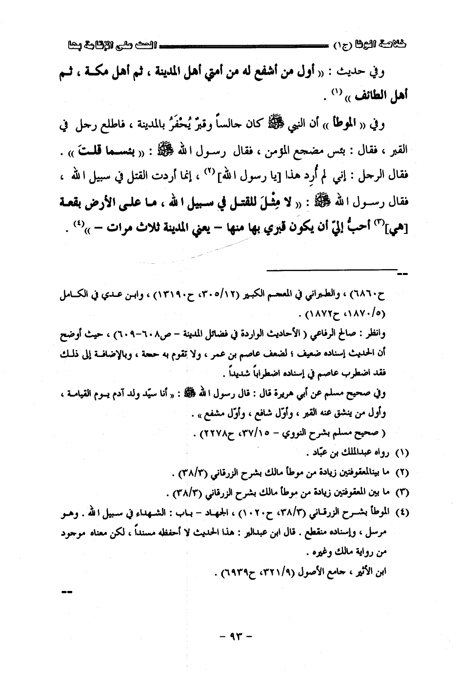 وفي حديث أوّل من أشفع له من أمتي أهل المدينة ثم أهل مكة ثم أهل الطائف وفي الموطأ أنّ النبي صلى الله عليه وسلم كان جالسا وقبر يحفر بالمدينة فاطلع رجل في القبر فقال بئس مضجع المؤمن فقال رسول الله صلى الله عليه وسلم بئسما قلت قال الرجل أني لم أرد هذا إنما أردت القتل في سبيل الله فقال رسول الله صلى الله عليه وسلم لا مثل للقتل في سبيل الله ما على الأرض بقعة أحب إليّ من أن يكون قبري بها منها يعني المدينة ثلاث مرّات