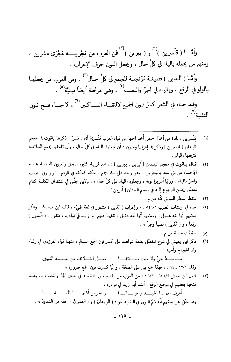 وأمَّا (قنّسرين) و (يبرين) فَمن الْعَرَب من يُجْريه مُجْرَى عشْرين وَمِنْهُم من يَجعله بِالْيَاءِ فِي كلّ حَال وَيجْعَل النُّون حرف الْإِعْرَاب