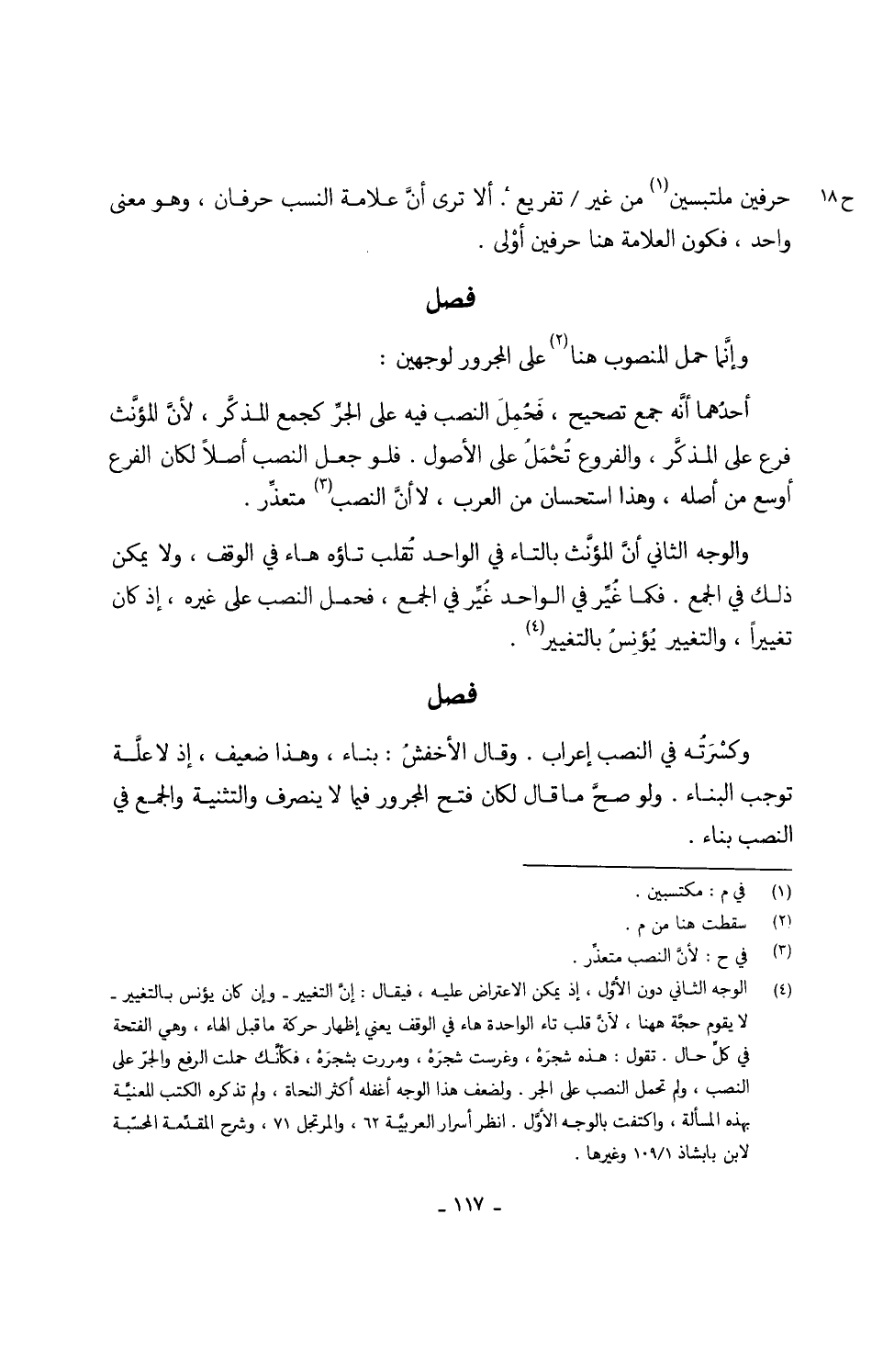 أحدُهما أنَّه جمع تَصْحِيح فَحُمِلَ النصب فِيهِ على الجرَّ كجمع المذكَّر لأنَّ المؤنَّث فرع على المذكَّر وَالْفُرُوع تُحْمَلُ على الْأُصُول فَلَو جعل النصب أصلا لَكَانَ الْفَرْع أوسع من أَصله وَهَذَا اسْتِحْسَان من الْعَرَب لَا أنَّ النصب متعذَّر