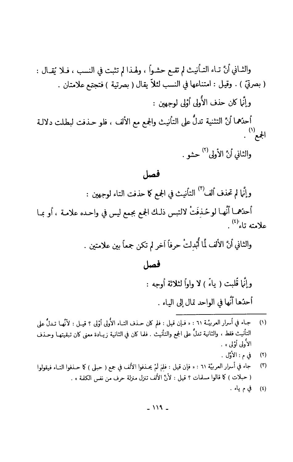 وَالثَّانِي أنَّ تَاء التَّأْنِيث لم تقع حَشْوًا وَلِهَذَا لم تثبت فِي النّسَب فَلَا يُقال (بصرتيّ) وَقيل امتناعها فِي النّسَب لئلاّ يُقَال (بصرتية) فتجمتع علامتان