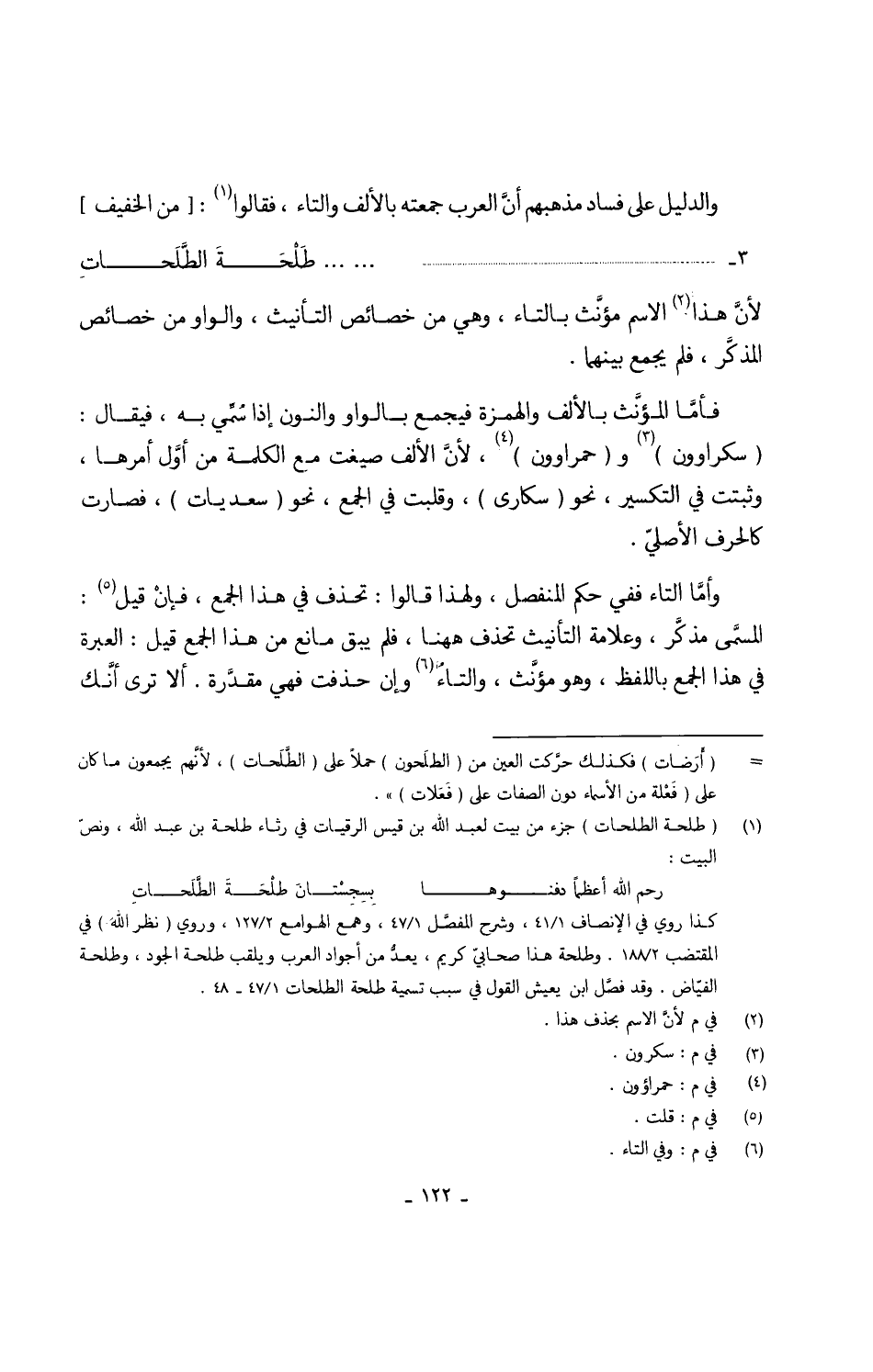 وَالدَّلِيل على فَسَاد مَذْهَبهم أنَّ الْعَرَب جمعته بِالْألف وَالتَّاء فَقَالُوا 3 - طَلْحة الطَّلحاتِ لأنَّ هَذَا الِاسْم مؤنث بِالتَّاءِ وَهِي من خَصَائِص التَّأْنِيث وَالْوَاو من خَصَائِص المذكَّر فَلم يجمع بَينهمَا