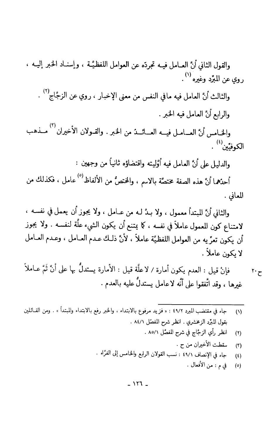 وَالثَّانِي أنَّ الْمُبْتَدَأ مَعْمُول ولابدَّ لَهُ من عَامل وَلَا يجوز أَن يعْمل فِي نَفسه لِامْتِنَاع كَون الْمَعْمُول عَاملا فِي نَفسه كَمَا يمْتَنع أَن يكون الشَّيْء علَّة لنَفسِهِ وَلَا يجوز أَن يكون تعرِّية من العوامل اللفظيَّة عَاملا لِأَن ذَلِك عدم الْعَامِل وَعدم الْعَامِل لَا يكون عَاملا فإنْ قيل الْعَدَم يكون أَمارَة لَا علّة قيل الأمارة يستدلُّ بهَا على أنَّ ثَمَّ عَاملا غَيرهَا وَقد اتَّفقوا على أنَّه لَا عَامل يستدُّل عَلَيْهِ بِالْعدمِ