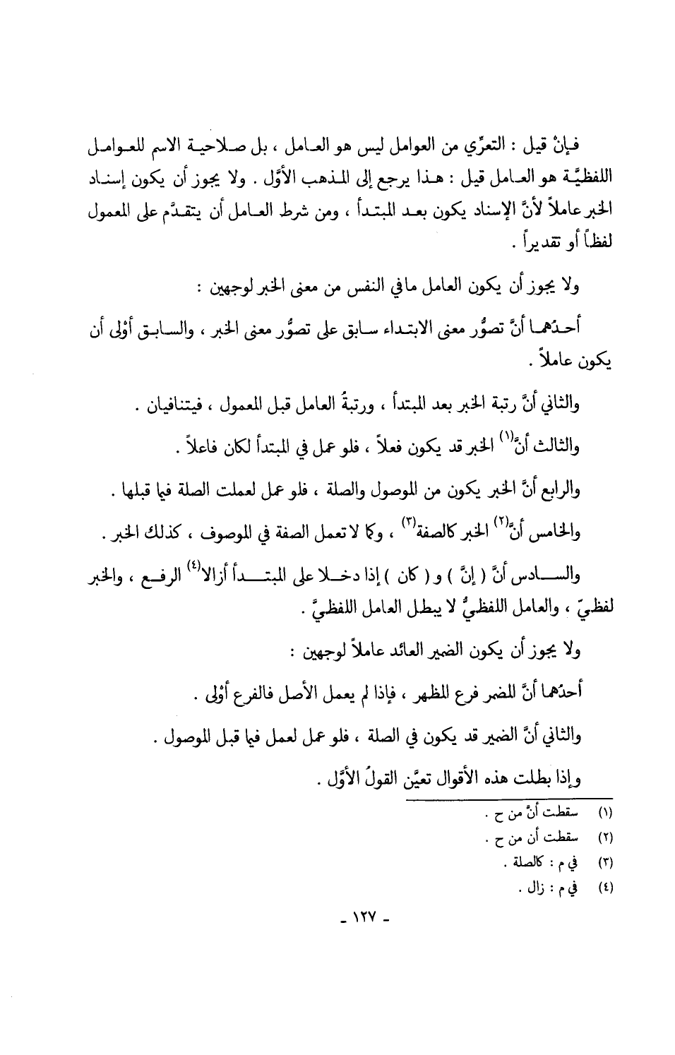 أَحدهمَا أنَّ تصوُّر معنى الأبتداء سَابق على تصوُّر معنى الْخَبَر وَالسَّابِق أوْلى أَن يكون عَاملا وَالثَّانِي أنَّ رتبه الْخَبَر بعد الْمُبْتَدَأ ورتبةُ الْعَامِل قبل الْمَعْمُول فيتنافيان وَالثَّالِث أنَّ الْخَبَر قد يكون فعلا فَلَو عمل فِي الْمُبْتَدَأ لَكَانَ فَاعِلا وَالرَّابِع أنَّ الْخَبَر يكون من الْمَوْصُول والصلة فَلَو عمل لعملت الصِّلَة فِيمَا قبلهَا وَالْخَامِس أنَّ الْخَبَر كالصفة وكما لَا تعْمل الصّفة فِي الْمَوْصُوف كَذَلِك الْخَبَر وَالسَّادِس أنَّ (إنَّ) و (كَانَ) إِذا دخلا على الْمُبْتَدَأ أزالا الرّفْع وَالْخَبَر لفظيُّ وَالْعَامِل اللفظيُّ لَا يبطل الْعَامِل اللفظيَّ وَلَا يجوز أنَّ يكون الضَّمِير الْعَائِد عَاملا لوَجْهَيْنِ أحدُهما أنَّ الْمُضمر فرع الْمظهر فَإِذا لم يعْمل الأَصْل فالفرع أوْلى وَالثَّانِي أنَّ الضَّمِير قد يكون فِي الصِّلَة فَلَو عمل لعمل فِيمَا قبل الْمَوْصُول وَإِذا بطلت هَذِه الْأَقْوَال تعيَّن القولُ الأوَّل