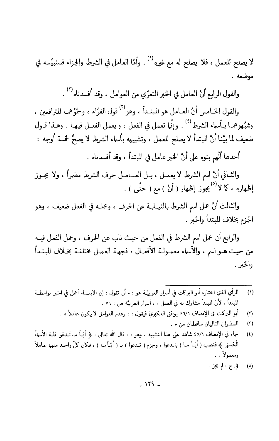 أَحدهَا أنَّهم بنوه على أنَّ الْخَبَر عَامل فِي الْمُبْتَدَأ وَقد أفسدناه وَالثَّانِي أنَّ اسْم الشَّرْط لَا يعْمل بل الْعَامِل حرف الشَّرْط مضمراً وَلَا يجوز إِظْهَاره كَمَا لَا يجوز إِظْهَار (أنْ) مَعَ (حَتَّى) وَالثَّالِث أنَّ عمل اسْم الشَّرْط بالنيابة عَن الْحَرْف وَعَمله فِي الْفِعْل ضَعِيف هُوَ الْجَزْم بِخِلَاف الْمُبْتَدَأ وَالْخَبَر وَالرَّابِع أَن عمل اسْم الشَّرْط فِي الْفِعْل من حَيْثُ نَاب عَن الْحَرْف وَعمل الْفِعْل فِيهِ من حَيْثُ هُوَ اسْم والأسماء معمولة الْأَفْعَال فجهة الْعَمَل مُخْتَلفَة بِخِلَاف الْمُبْتَدَأ وَالْخَبَر
