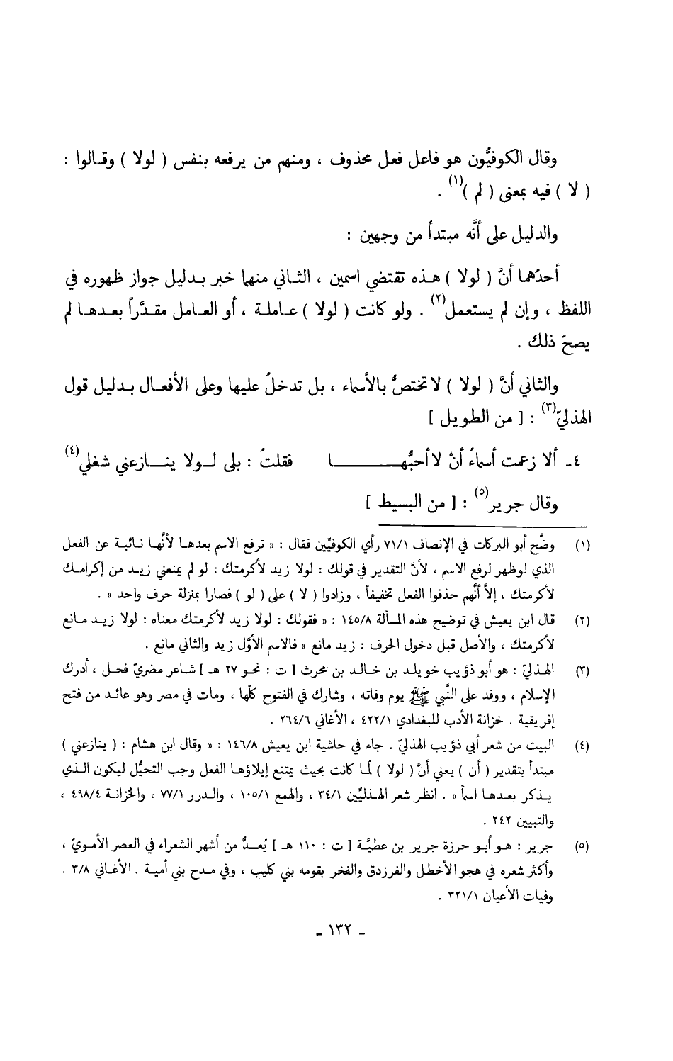 وَقَالَ الكوفيٌّون هُوَ فَاعل فعل مَحْذُوف وَمِنْهُم من يرفعهُ بِنَفس (لَوْلَا) وَقَالُوا (لَا) فِيهِ بِمَعْنى (لم) وَالدَّلِيل على أنَّه مُبْتَدأ من وَجْهَيْن أحدهمَّا أنَّ (لَوْلَا) هَذِه تَقْتَضِي اسْمَيْنِ الثَّانِي مِنْهُمَا خبر بِدَلِيل جَوَاز ظُهُوره فِي اللَّفْظ وَإِن لم يسْتَعْمل وَلَو كَانَت (لَوْلَا) عاملة أَو الْعَامِل مقدَّراً بعْدهَا لم يصحّ ذَلِك وَالثَّانِي أنَّ (لَوْلَا) لَا تختصُّ بالأسماء بل تدخل عَلَيْهَا وعَلى الْأَفْعَال بِدَلِيل قَول الْهُذلِيّ // الطَّوِيل // 4 -