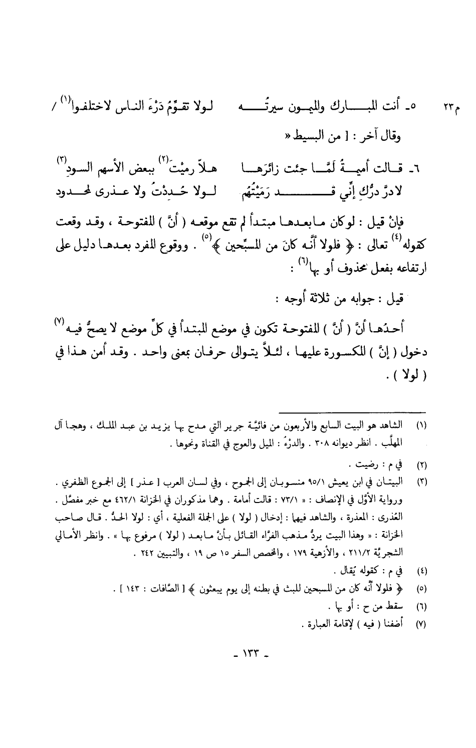 (لادرَّ درُّكِ إنَّي قد رَمَيْتُهُم ... لَوْلَا حُدِدْتُ وَلَا عذرى لمحدود) // الْبَسِيط // فإنْ قيل لَو كَانَ مَا بعْدهَا مُبْتَدأ لم تقع موقعه (أنَّ) الْمَفْتُوحَة وَقد وَقعت كَقَوْلِه تَعَالَى {فلولا أنَّه كانَ من المسبّحين} وَوُقُوع الْمُفْرد بعْدهَا دَلِيل على ارتفاعه بِفعل مَحْذُوف أَو بهَا قيل جَوَابه من ثَلَاثَة أوجه أحدُها أنَّ (أنَّ) الْمَفْتُوحَة تكون فِي مَوضِع الْمُبْتَدَأ فِي كلّ مَوضِع لَا يصحُّ فِيهِ دُخُول (إنَّ) الْمَكْسُورَة عَلَيْهَا لئلاَّ يتوالى حرفان بِمَعْنى وَاحِد وَقد أَمن هَذَا فِي (لَوْلَا)