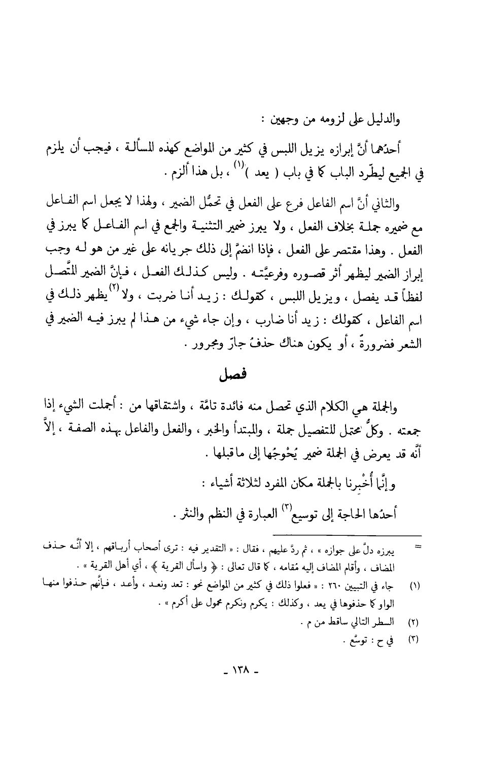 وَالْجُمْلَة هِيَ الْكَلَام الَّذِي تحصل مِنْهُ فَائِدَة تامَّة واشتقاقها من أجملت الشَّيْء إِذا جمعته وكلَّ مُحْتَمل للتفصيل جملَة والمبتدأ وَالْخَبَر وَالْفِعْل وَالْفَاعِل بِهَذِهِ الصّفة إلاَّ أنَّه قد يعرض فِي الْجُمْلَة يُحْوجُها إِلَى مَا قبلهَا