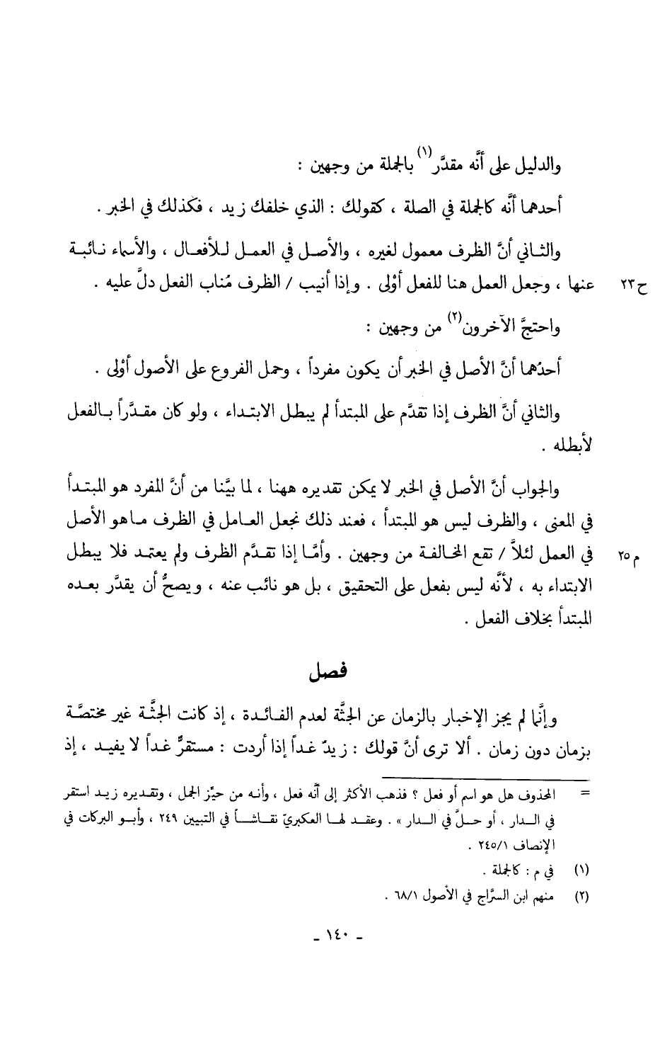 وَالْأَصْل فِي الْعَمَل للأفعال والأسماء نائبة عَنْهَا وَجعل الْعَمَل هُنَا للْفِعْل أوْلى وَإِذا أنيب الظّرْف مُناب الْفِعْل دلَّ عَلَيْهِ واحتجَّ الْآخرُونَ من وَجْهَيْن أَحدهمَا أنَّ الأَصْل فِي الْخَبَر أَن يكون مُفردا وَحمل الْفُرُوع على الْأُصُول أولى وَالثَّانِي أَن الظّرْف إِذا تقدم على الْمُبْتَدَأ لم يبطل الِابْتِدَاء وَلَو كَانَ مقدَّراً بِالْفِعْلِ لأبطله وَالْجَوَاب أنَّ الأَصْل فِي الْخَبَر لَا يُمكن تَقْدِيره هَهُنَا لما بيَّنا من أنَّ الْمُفْرد هُوَ الْمُبْتَدَأ فِي الْمَعْنى والظرف لَيْسَ هوالمبتدأ فَعِنْدَ ذَلِك نجْعَل الْعَامِل فِي الظّرْف مَا هُوَ الأَصْل فِي الْعَمَل لئلاَّ تقع الْمُخَالفَة من وَجْهَيْن وأمَّا إِذا تقدم الظّرْف وَلم يعْتَمد فَلَا يبطل الِابْتِدَاء بِهِ لأنَّه لَيْسَ بِفعل على التَّحْقِيق بل هُوَ نَائِب عَنهُ ويصحُّ ان يقدَّر بعده الْمُبْتَدَأ بِخِلَاف الْفِعْل