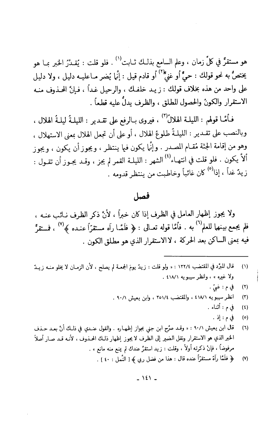 فأمَّا قَوْلهم اللَّيْلَة الهلالُ فيروى بِالرَّفْع على تَقْدِير الليلةُ ليلةُ الْهلَال وَبِالنَّصبِ على تَقْدِير اللَّيْلَة طلوعُ الْهلَال أَو على أَن تجْعَل الْهلَال بِمَعْنى الاستهلال وَهُوَ من إِقَامَة الجثة مُقام الْمصدر وإنَّما يكون فِيمَا ينْتَظر وَيجوز أَن يكون وَيجوز ألاَّ يكون فَلَو قلت فِي انْتِهَاء الشَّهْر اللَّيْلَة الْقَمَر لم يجز وَقد يجوز أَن تَقول زيدٌ غَدا إِذا كَانَ غَائِبا وخاطبت من ينْتَظر قدومه