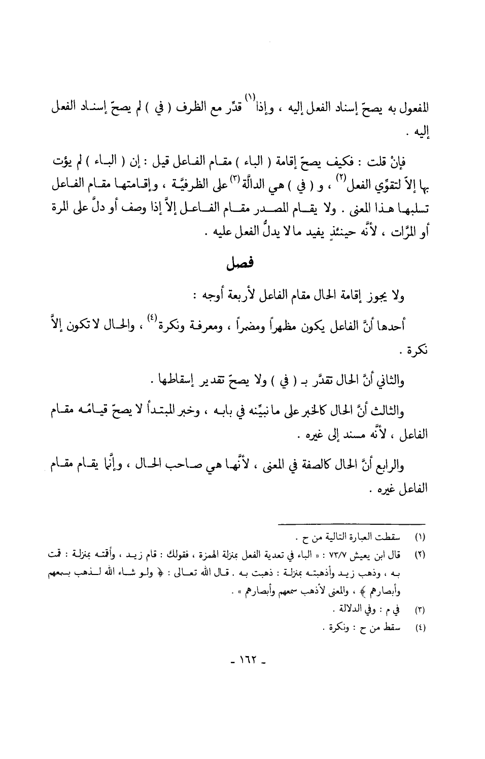 قإنْ قلت فَكيف يصحّ إِقَامَة (الْبَاء) مقَام الْفَاعِل قيل إِن (الْبَاء) لم يُؤْت بهَا إلاّ لتقوّي الْفِعْل و (فِي) هِيَ الدالَّة على الظرفيَّة وإقامتها مقَام الْفَاعِل تسلبها هَذَا الْمَعْنى وَلَا يُقَام الْمصدر مقَام الْفَاعِل إلاَّ إِذا وصف أَو دلَّ على الْمرة أَو المرَّات لِأَنَّهُ حينئذٍ يُفِيد مَالا يدلُّ الْفِعْل عَلَيْهِ