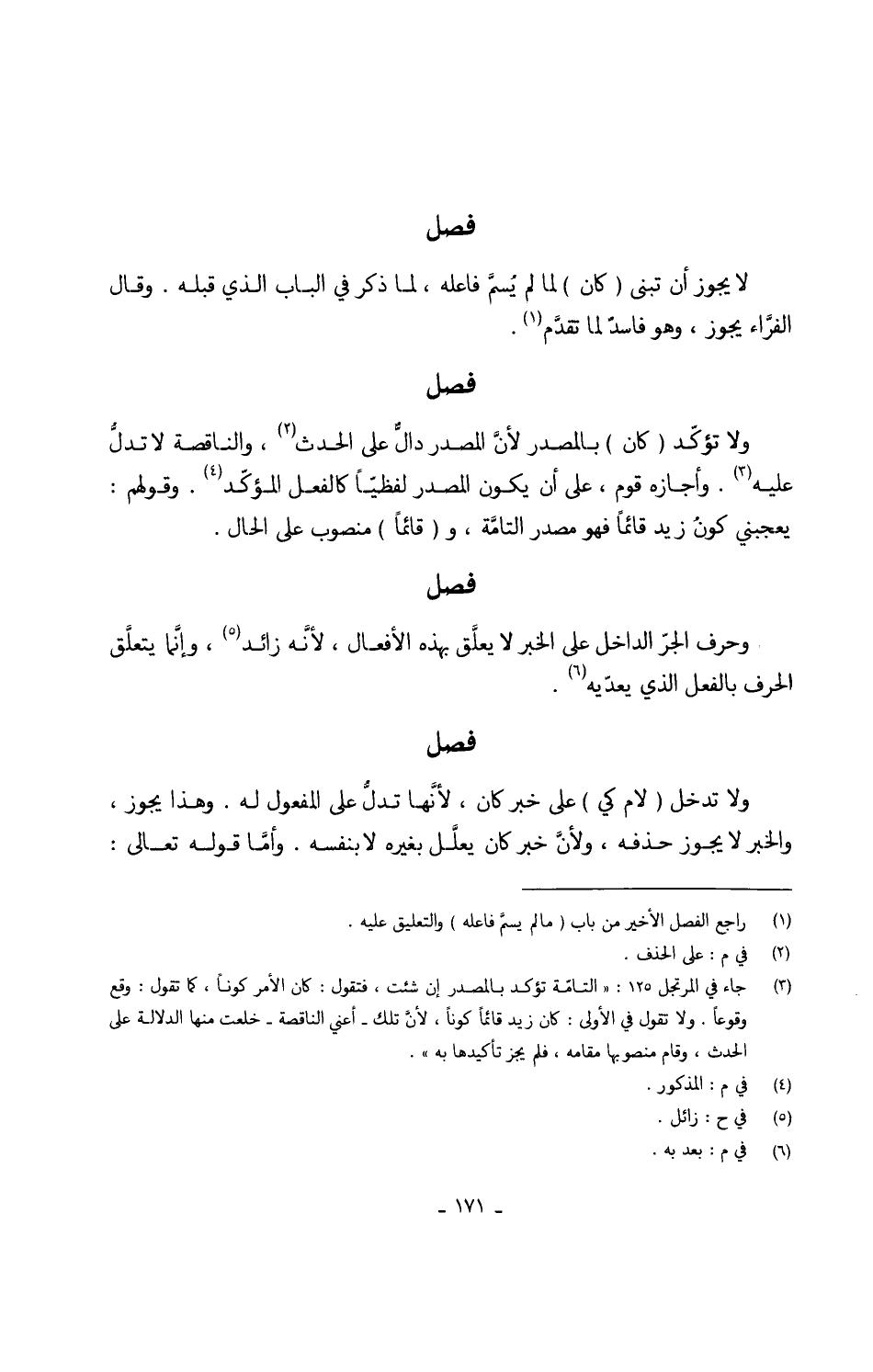 وَلَا تؤكّد (كَانَ) بِالْمَصْدَرِ لأنَّ الْمصدر دالٌّ على الْحَدث والناقصة لَا تدلُّ عَلَيْهِ وَأَجَازَهُ قوم على أَن يكون الْمصدر لفظيّاً كالفعل المؤكّد وَقَوْلهمْ يُعجبنِي كونُ زيد قَائِما فَهُوَ مصدر التامَّة و (قَائِما) مَنْصُوب على الْحَال