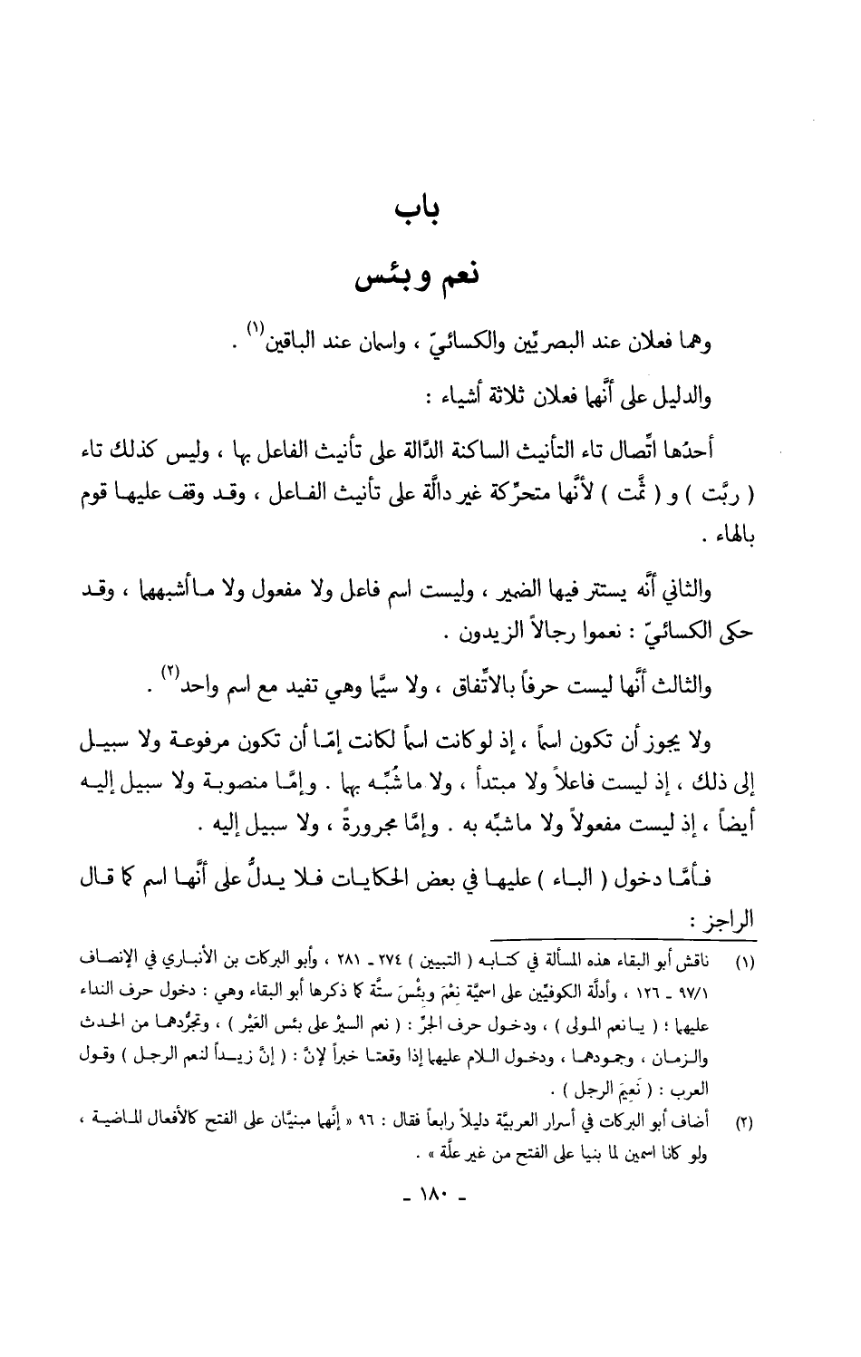 وهما فعلان عِنْد البصرييَّن وَالْكسَائِيّ واسمان عِنْد البَاقِينَ وَالدَّلِيل على أنَّهما فعلان ثَلَاثَة أَشْيَاء أحدُهما اتَّصال تَاء التَّأْنِيث الساكنة الدّالة على تَأْنِيث الْفَاعِل بهَا وَلَيْسَ كَذَلِك تَاء (ربَّت) و (ثَّمت) لأنَّها متحَّركة غير داَّلة على تَأْنِيث الْفَاعِل وَقد وقف عَلَيْهَا قوم بِالْهَاءِ وَالثَّانِي أنَّه يسْتَتر فِيهَا الضَّمِير وَلَيْسَت اسْم فَاعل وَلَا مفعول وَلَا مَا أشبههما وَقد حكى الكسائيّ نعموا رجَالًا الزيدون وَالثَّالِث أنَّها لَيست حرفا بالِاتِّفَاقِ وَلَا سِيمَا وَهِي تفِيد مَعَ اسْم وَاحِد وَلَا يجوز أَن تكون اسْما إِذْ لَو كَانَت اسْما لكَانَتْ إمَّا أَن تكون مَرْفُوعَة وَلَا سَبِيل إِلَى ذَلِك إِذْ لَيست فَاعِلا وَلَا مُبْتَدأ وَلَا مَا شُبَّه بهما وإمَّا مَنْصُوبَة وَلَا سَبِيل إِلَيْهِ أَيْضا إِذْ لَيست مَفْعُولا وَلَا مَا شبَّه بِهِ وإمَّا مجرورةً وَلَا سَبِيل إِلَيْهِ فأمَّا دُخُول (الْبَاء) عَلَيْهَا فِي بعض الحكايات فَلَا يدلُّ على أنَّها اسْم كَمَا قَالَ الراجز