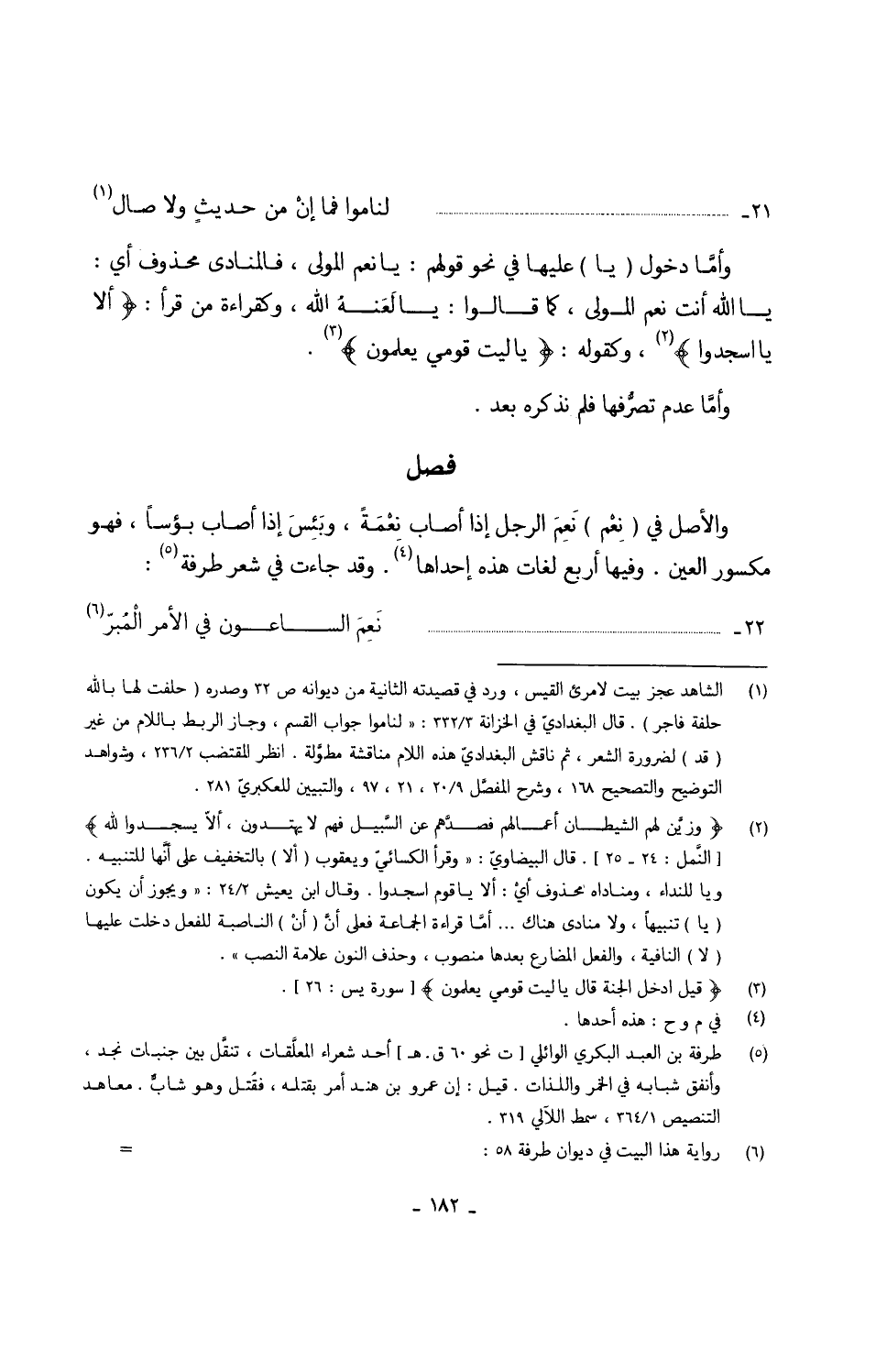 ( ... لناموا فَمَا إنْ من حديثٍ وَلَا صال) // الطَّوِيل // وأمَّا دُخُول (يَا) عَلَيْهَا فِي نَحْو قَوْلهم يانعم الْمولى فالمنادى مَحْذُوف أَي يَا الله أَنْت نعم الْمولى كَمَا قَالُوا يالَعَنهُ الله وكقراءة من قَرَأَ / أَلا يَا اسجدوا / وَكَقَوْلِه {يَا لَيْت قومِي يعلمُونَ} وأمَّا عدم تصرَّفها فَلم نذكرهُ بعد