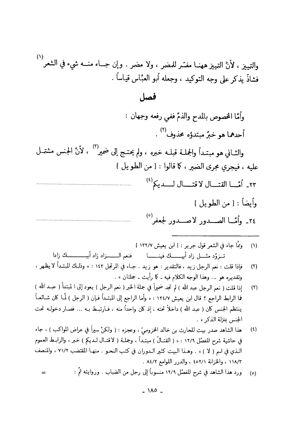 وأمَّا الْمَخْصُوص بالمدح والذمَّ فَفِي رَفعه وَجْهَان أَحدهمَا هُوَ خبرٌ مبتدؤه مَحْذُوف وَالثَّانِي هُوَ مُبْتَدأ وَالْجُمْلَة قبله خَبره وَلم يحْتَج لى ضمير لأنَّ الْجِنْس مُشْتَمل عَلَيْهِ فيجرى مجْرى الضَّمِير كَمَا قالو [من الطَّوِيل] 23 -