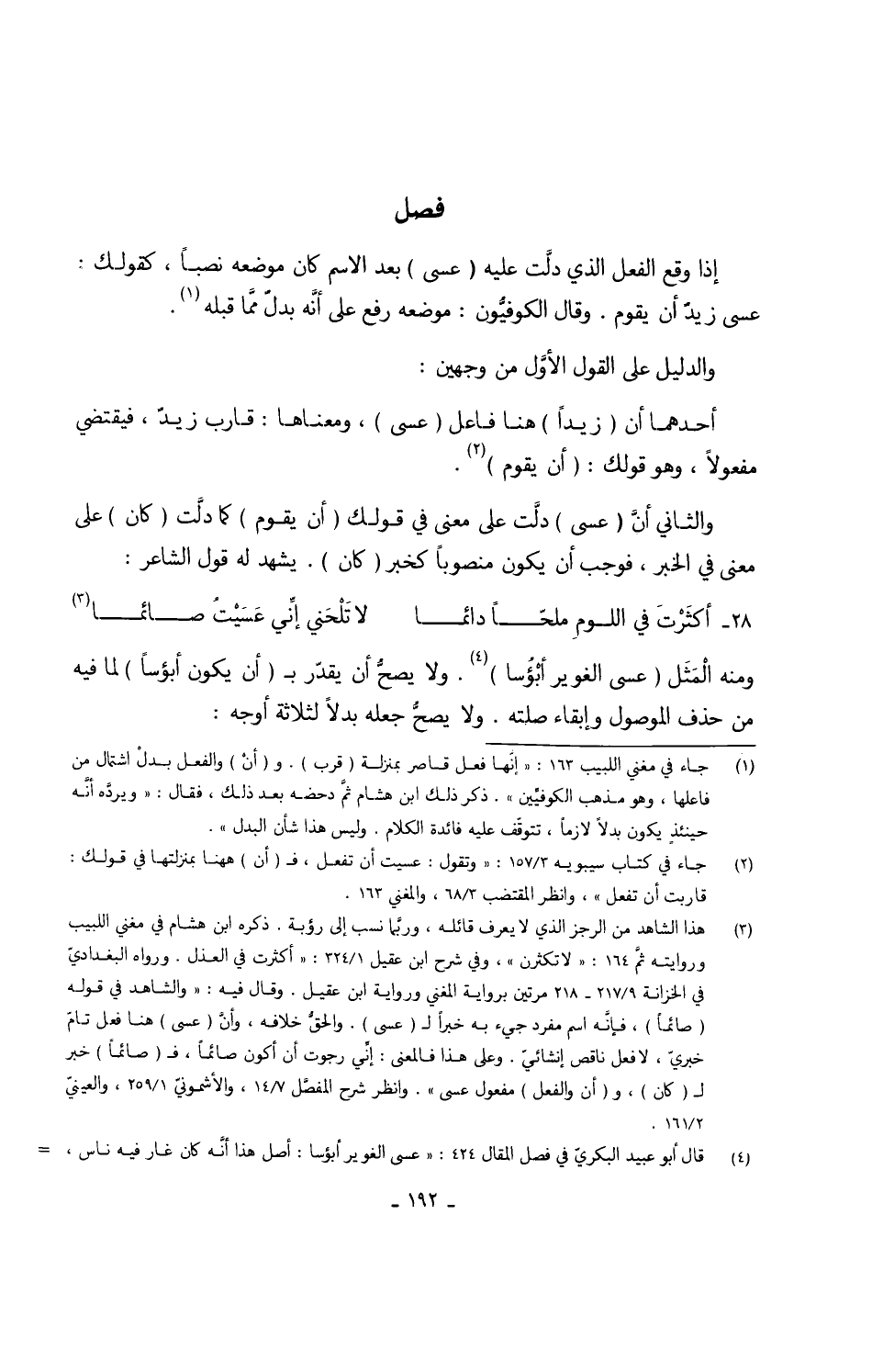 (أكثَرْتَ فِي اللومِ ملحّا دائمأ ... لَا تَلْحَني إنَّي عَسَيتُ صَائِما) // الرجز // وَمِنْه الْمَثَل (عَسى الغوير أبْؤُسا) وَلَا يصحُّ أَن يقدّر ب (أَن يكون أبوساً) لما فِيهِ من حذف الْمَوْصُول وإبقاء صلته وَلَا يصحَّ جعله بَدَلا لثَلَاثَة أوجه