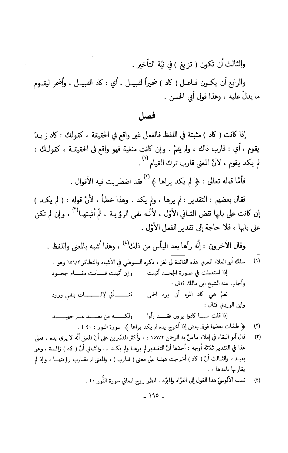 فأمَّا قَوْله تَعَالَى {لم يكد يَرَاهَا} فقد اضْطَرَبَتْ فِيهِ الْأَقْوَال فَقَالَ بَعضهم التَّقْدِير لم يرهَا وَلم يكد وَهَذَا خطأ لأنَّ قَوْله (لم يكد) إِن كَانَت على بَابهَا نقض الثَّانِي الأوَّل لأنَّه نفى الرُّؤْيَة ثمَّ أثبتها وَإِن لم تكن على بَابهَا فَلَا حَاجَة إِلَى تَقْدِير الْفِعْل الأوَّل وَقَالَ الْآخرُونَ إنَّه رَآهَا بعد الْيَأْس من ذَلِك وَهَذَا أشبه بِالْمَعْنَى وَاللَّفْظ