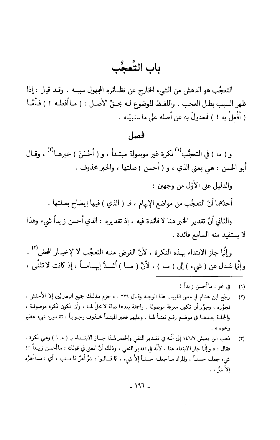 التَّعجُّب هُوَ الدهش من الشَّيْء الخارخ عَن نَظَائِره الْمَجْهُول سَببه وَقد قيل إِذا ظهر السَّبَب بَطل الْعجب وَاللَّفْظ الْمَوْضُوع لَهُ بحقًّ الأَصْل (مَا أَفعلهُ) فأمَّا (أفْعِلْ بِهِ) فمعدولٌ بِهِ عَن أَصله على مَا سنبيَّنه