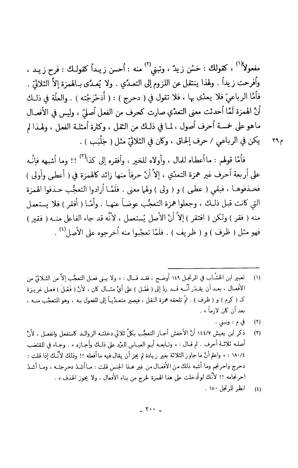 مَفْعُولا كَقَوْلِك حسن زيدٌ وتبني مِنْهُ أحسن زيدا كَقَوْلِك فَرح زيد وأفرحت زيدا وَلِهَذَا ينْتَقل عَن اللُّزُوم إِلَى التعدِّي وَلَا يُعدَّى بِالْهَمْزَةِ إلاَّ الثلاثي فأمَّا الرباعيّ فَلَا يعدَّى بهَا فَلَا تَقول فِي (دحرج) (أَدَحْرَجْته) والعلّة فِي ذَلِك أنَّ الْهمزَة لَمّا أحدثت معنى التعدِّي صَارَت كحرف من الْفِعْل أصليّ وَلَيْسَ فى الْأَفْعَال مَا هُوَ على خَمْسَة أحرف أصُول لما فِي ذَلِك من الثّقل وَكَثْرَة أَمْثِلَة الْفِعْل وَلِهَذَا لم يكن فِي الرباعي حرف إِلْحَاق وَكَانَ فِي الثلاثيّ مثل (جَلْبَبَ) فأمَّا قَوْلهم مَا أعطَاهُ لِلْمَالِ وأولاه للخير وأفقره إِلَى كَذَا وَمَا أشبه فإنَّه على أَرْبَعَة أحرف غير همزَة التعديّ إِلَّا أنَّ حرفا مِنْهَا زَائِد كالهمزة فِي (أعْطى وَأولى) فحذفوها فَبَقيَ (عطى) و (ولى) وَلَهُمَا معنى فلَمّا أَرَادوا التعجُّبُّ حذفوا الْهمزَة الَّتِى كَانَت قبل ذَلِك وَجعلُوا همزَة التعجُّب عوضا عَنْهَا وأمَّا (أفقر) فَلَا يسْتَعْمل مِنْهُ (فقر) وَلَكِن (افْتقر) إلاَّ أنَّ الأَصْل يسْتَعْمل لأنَّه قد جَاءَ الْفَاعِل مِنْهُ (فَقير) فَهُوَ مثل (ظرف) وظريف) فلّمّا تعجبوا مِنْهُ أَخْرجُوهُ على الأَصْل