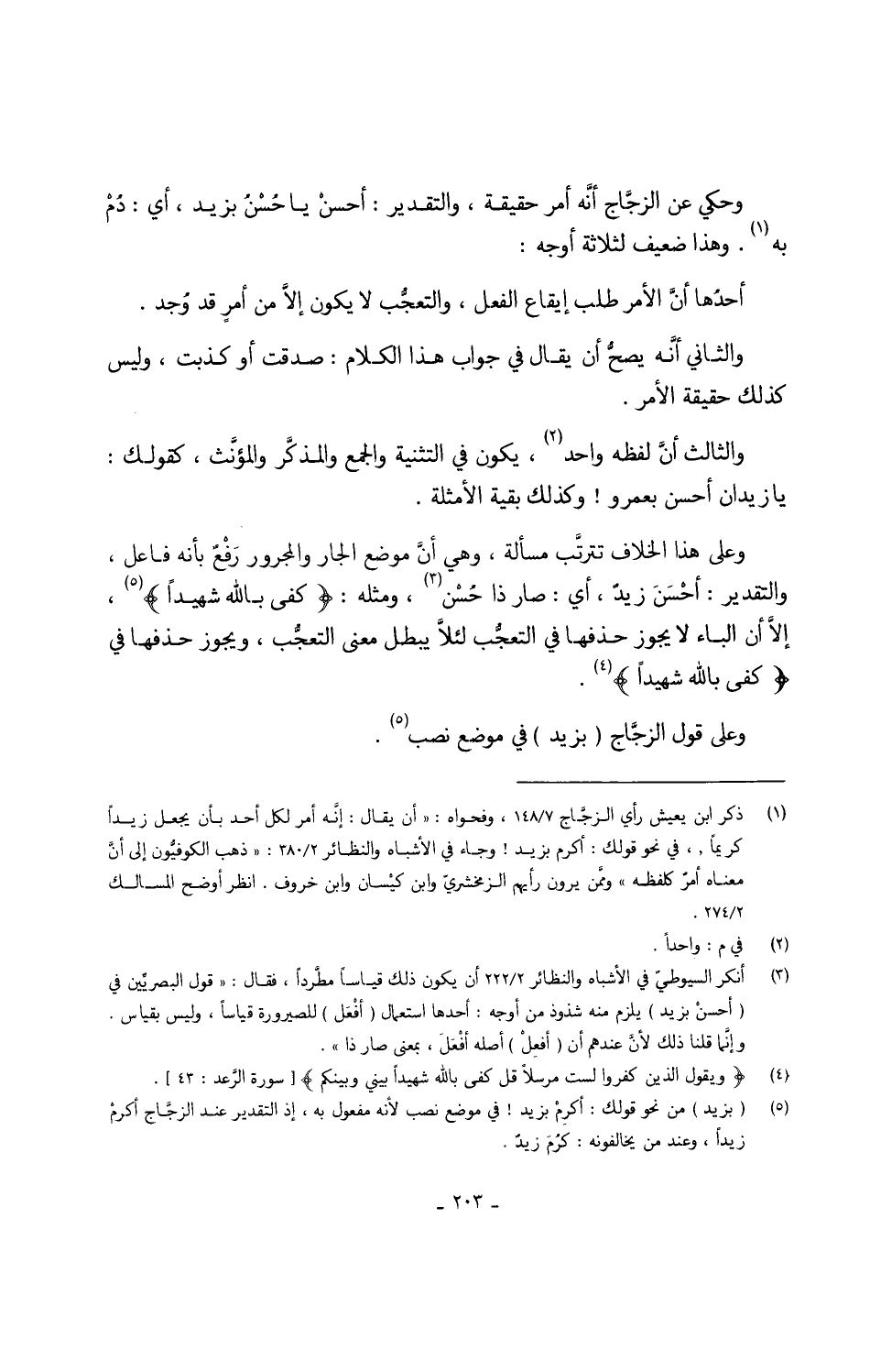 وَحكي عَن الزَّجاج أنَّه أَمر حَقِيقَة وَالتَّقْدِير أحسنْ يَا حُسْنُ بزيد: أَي دُم أيذُمْ بِهِ وَهَذَا ضَعِيف لثَلَاثَة أوجه أَحدهَا أنَّ الْأَمر طلب إِيقَاع الْفِعْل والتعجُّب لَا يكون إلاَّ من أمرٍ قد وُجد