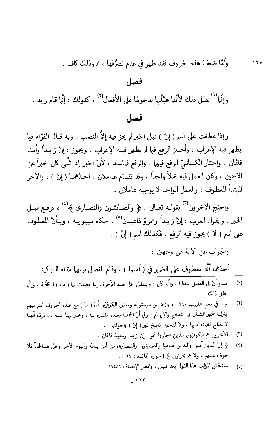 واحتجَّ الْآخرُونَ بقوله تَعَالَى {والصابئون وَالنَّصَارَى} فَرفع قبل الْخَبَر وَيَقُول الْعَرَب إنَّ زيدا وعمروٌ ذاهبان حَكَاهُ سِيبَوَيْهٍ وبأنَّ الْمَعْطُوف على اسْم (لَا) يجوز فِيهِ الرّفْع فَكَذَلِك اسْم (إنَّ)