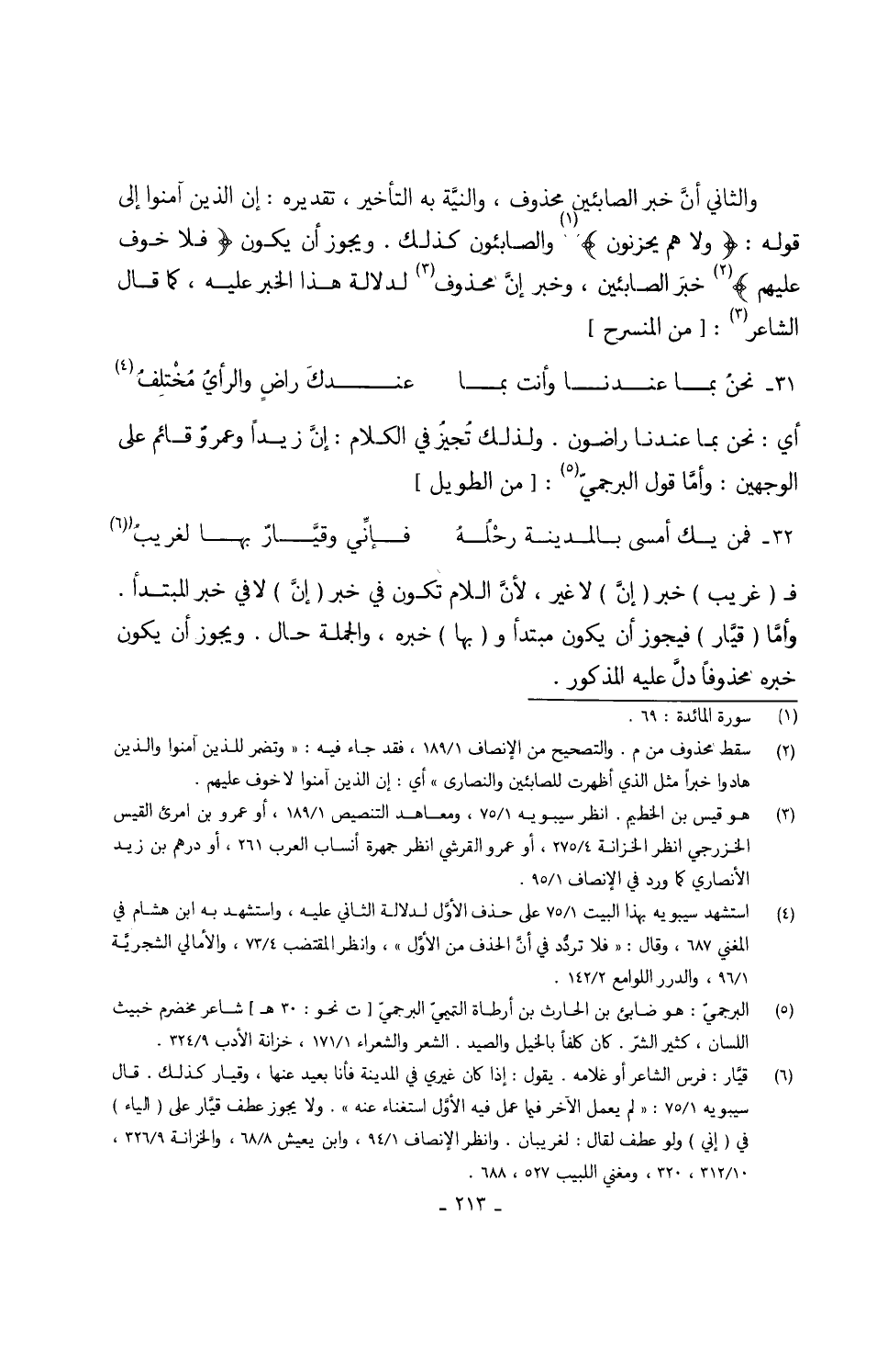 (نحنُ بِمَا عندنَا وَأَنت بِمَا ... عنْدك راضٍ والرأيُ مُخْتلِفُ) // المنسرح // أَي نَحن بِمَا عندنَا راضون وَلذَلِك تُجيُز فِي الْكَلَام إنَّ زيداُ وعمروٌ قَائِم على الْوَجْهَيْنِ وأمَّا قَول البرجمي // الطَّوِيل // 32 -