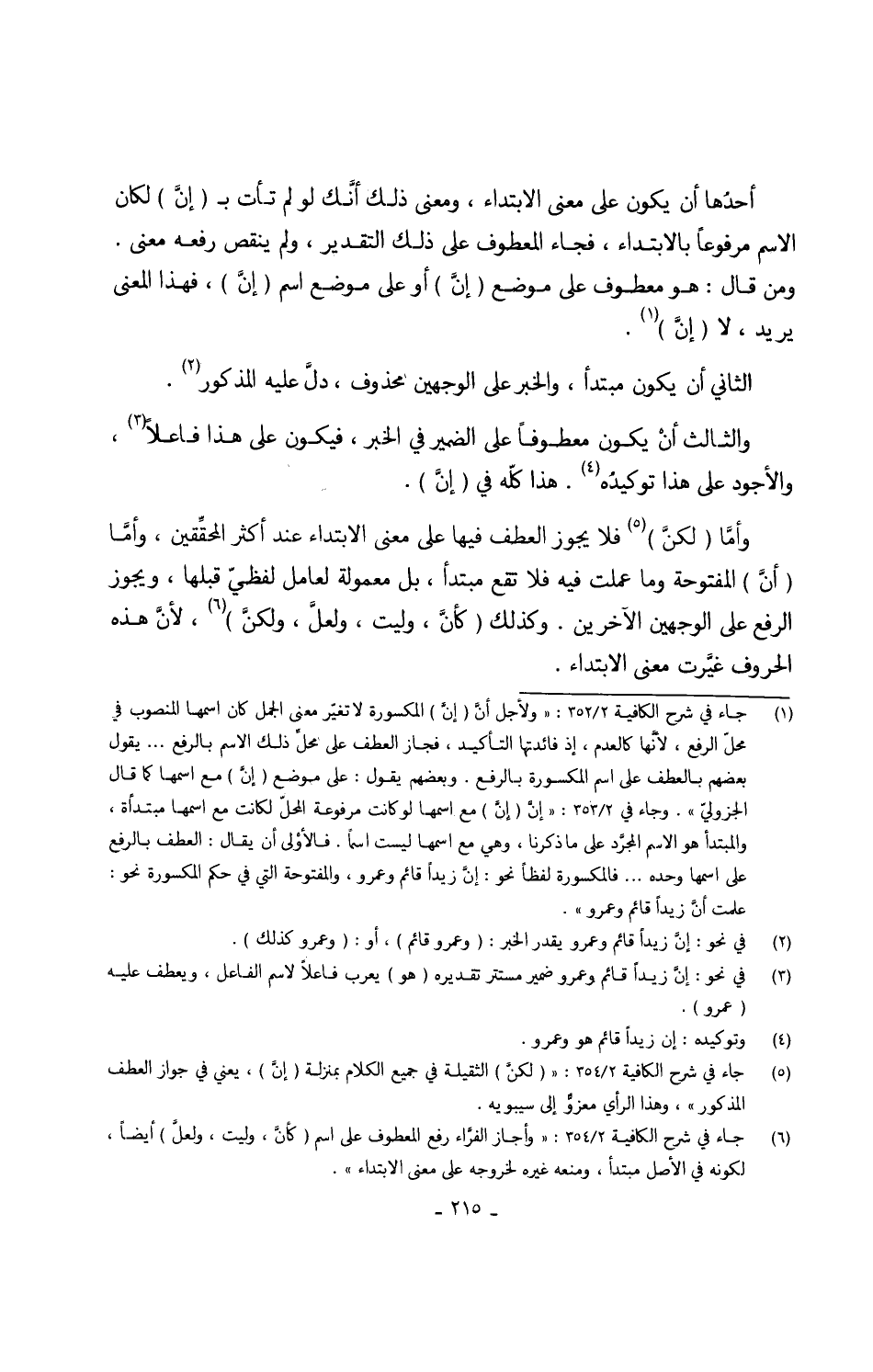 وأمَّا (لكنَّ) فَلَا يجوز الْعَطف فِيهَا على معنى الِابْتِدَاء عِنْد أَكثر المحقّقين وأمَّا (أنَّ) الْمَفْتُوحَة وَمَا عملت فِيهِ فَلَا تقع مُبْتَدأ بل معمولة لعامل لفظيّ قبلهَا وَيجوز الرّفْع على الْوَجْهَيْنِ الآخرين وَكَذَلِكَ (كأنَّ وليت ولعلَّ ولكنَّ) لأنَّ هَذِه الْحُرُوف غيَّرت معنى الِابْتِدَاء