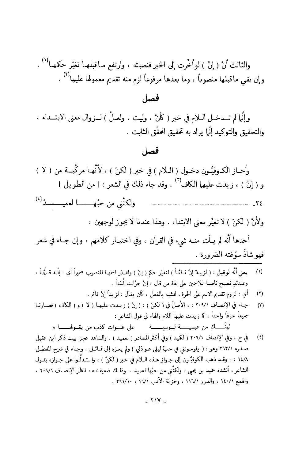 ( ... ولكننَّي من حبَّها لعميدُ) // الطَّوِيل // ولأنَّ (لكنّ) لَا تغيَّر معنى الِابْتِدَاء وَهَذَا عندنَا لَا يجوز لوَجْهَيْنِ أَحدهَا أنَّه لم يَأْتِ مِنْهُ شَيْء فِي الْقُرْآن وَفِي أختيار كَلَامهم وَإِن جَاءَ فِي شعر فَهُوَ شاذّ سوَّغته الضَّرُورَة