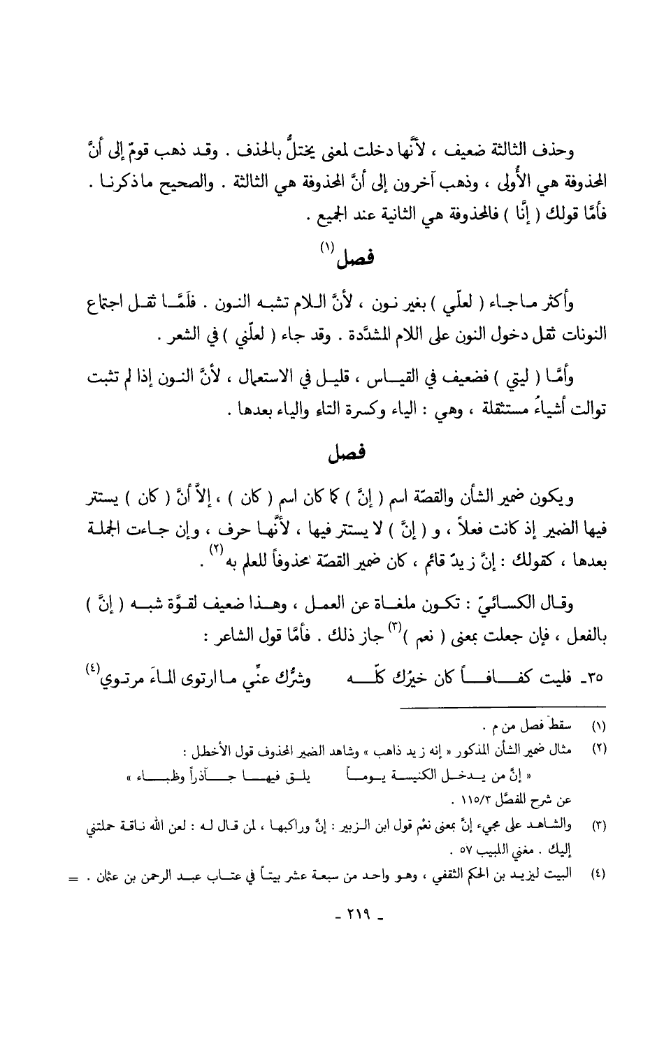 وَيكون ضمير الشَّأْن والقصّة اسْم (إنَّ) كَمَا كَانَ اسْم (كَانَ) إلاَّ أنَّ (كَانَ) يسْتَتر فِيهَا الضَّمِير إِذْ كَانَت فعلاًو (إنَّ) لَا يسْتَتر فِيهَا لأنَّها حرف وَإِن جَاءَت الْجُمْلَة بعْدهَا كَقَوْلِك إنَّ زيدٌ قَائِم كَانَ ضمير القصّة محذوفاً للْعلم بِهِ