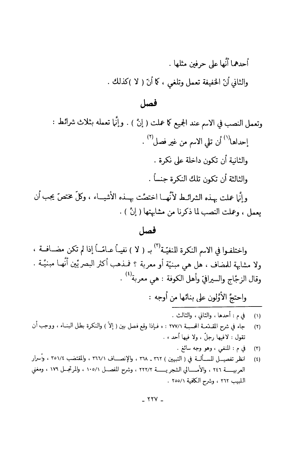 وَالثَّانيَِة أَن تكون دَاخِلَة على نكرَة وَالثَّالِثَة أَن تكون تِلْكَ النكرَة جنساُ وإنَّما عملت بِهَذِهِ الشَّرَائِط لأنَّها اخْتصّت بِهَذِهِ الْأَشْيَاء وكلّ مختصّ يجب أَن يعْمل وعملت النصب لما ذكرنَا من مشابهتها (إنَّ)