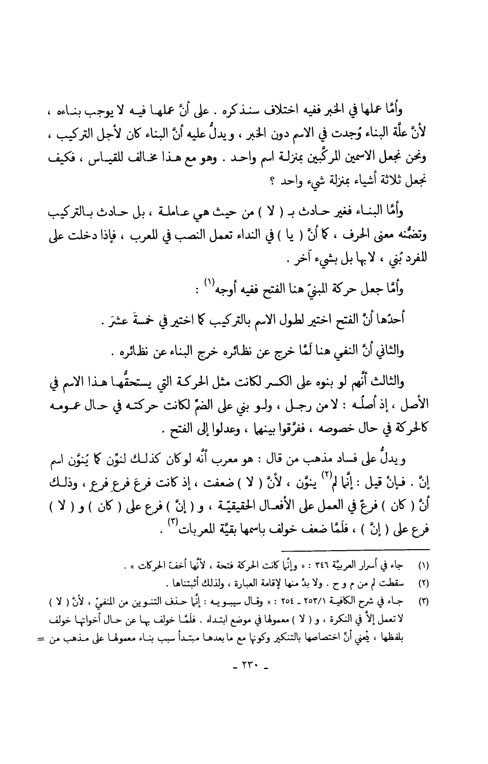 ويدلَّ على فَسَاد مَذْهَب من قَالَ هُوَ مُعرب أنَّه لَو كَانَ كَذَلِك لنوَن كَمَا يُنَّون اسْم إنَّ فإنْ قيل إنَّما لم ينَّون لأنَّ (لَا) ضعفت إِذْ كَانَت فرعَ فرعِ فرعٍ وَذَلِكَ أنَّ (كَانَ) فرعٌ فِي الْعَمَل على الْأَفْعَال الحقيقّة و (إنَّ) فرع على (كَانَ) و (لَا) فرع على (إنَّ) فلمَّا ضعف خُولِفَ باسمها بَقِيَّة المعربات