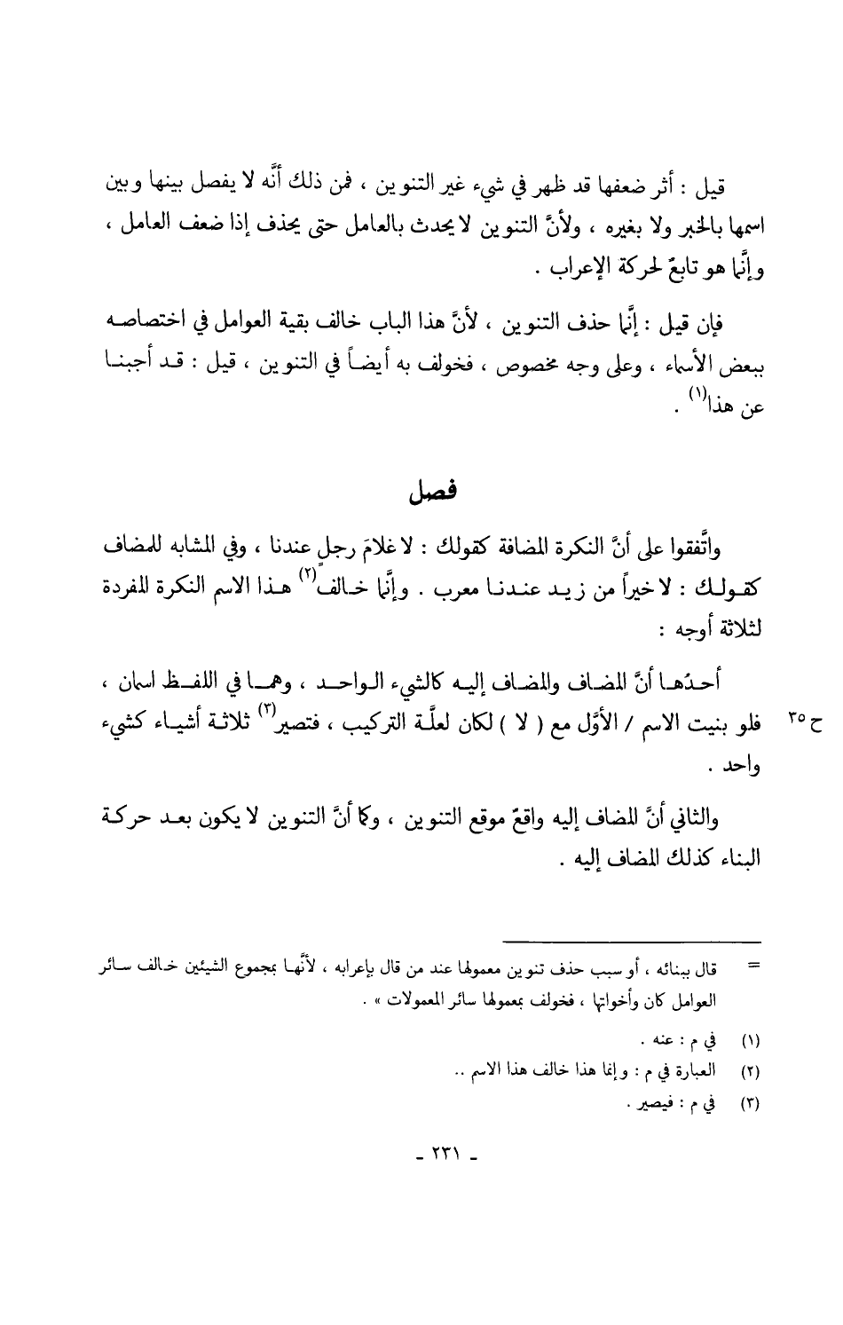 فَإِن قيل إِنَّمَا حذف التَّنْوِين لِأَن هَذَا الْبَاب خَالف بَقِيَّة العوامل فِي اخْتِصَاصه بِبَعْض الْأَسْمَاء وعَلى وَجه مَخْصُوص فخولف بِهِ أَيْضا فِي التَّنْوِين قيل قد أجبنا عَن هَذَا