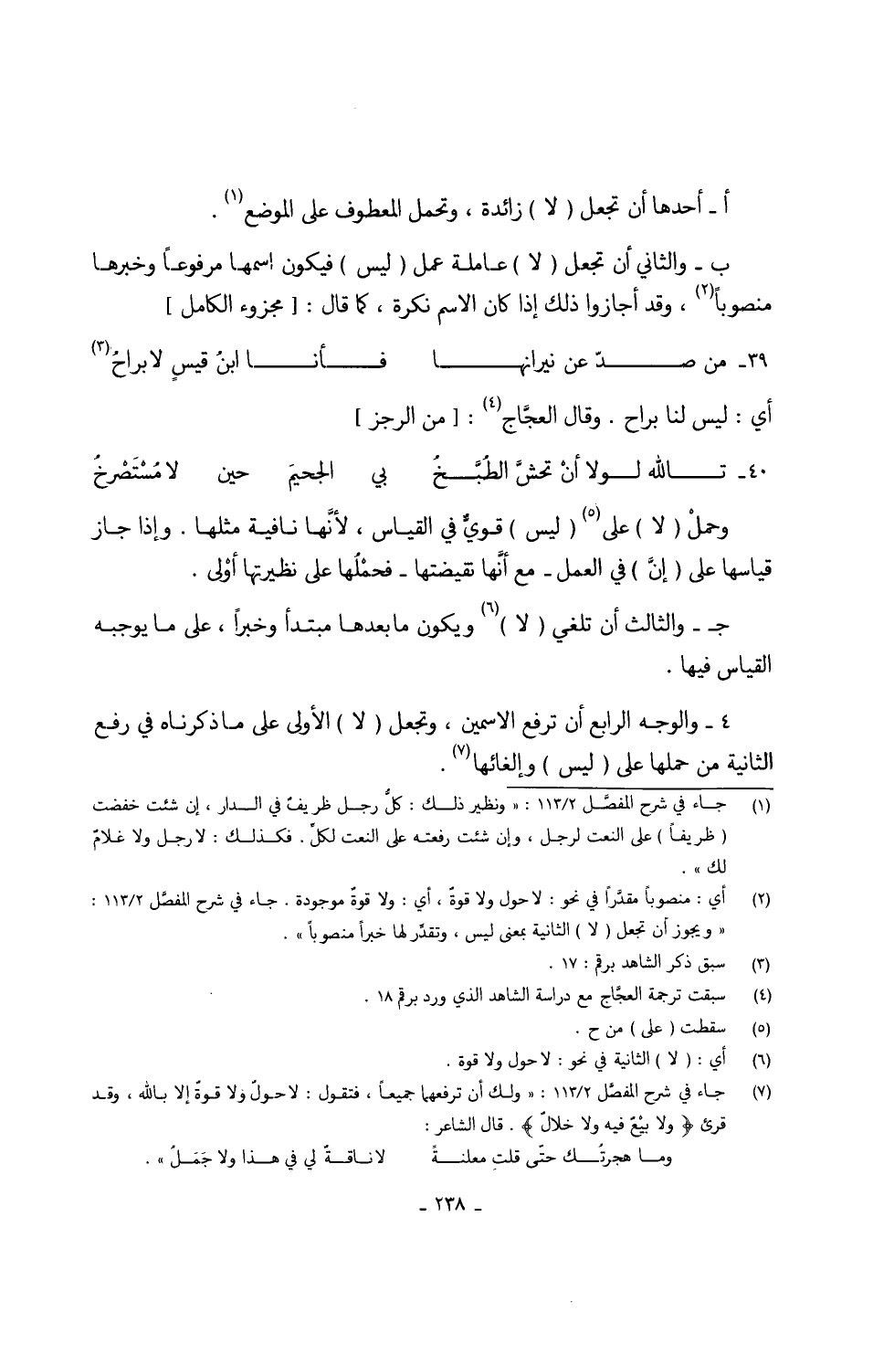 (تالله لَوْلَا أَن تحش الطَّبْخ ... بِي الْجَحِيم حِين لَا مُسْتَصْرحُ) // الرجز // وحملْ (لَا) على (لَيْسَ) قويٌّ فِي الْقيَاس لأنَّها نَافِيَة مثلهَا وَإِذا جَازَ قياسها على (إنَّ) فِي الْعَمَل - مَعَ أنَّها نقيضتها - فحْملُها على نظيرتها أوْلى ج -