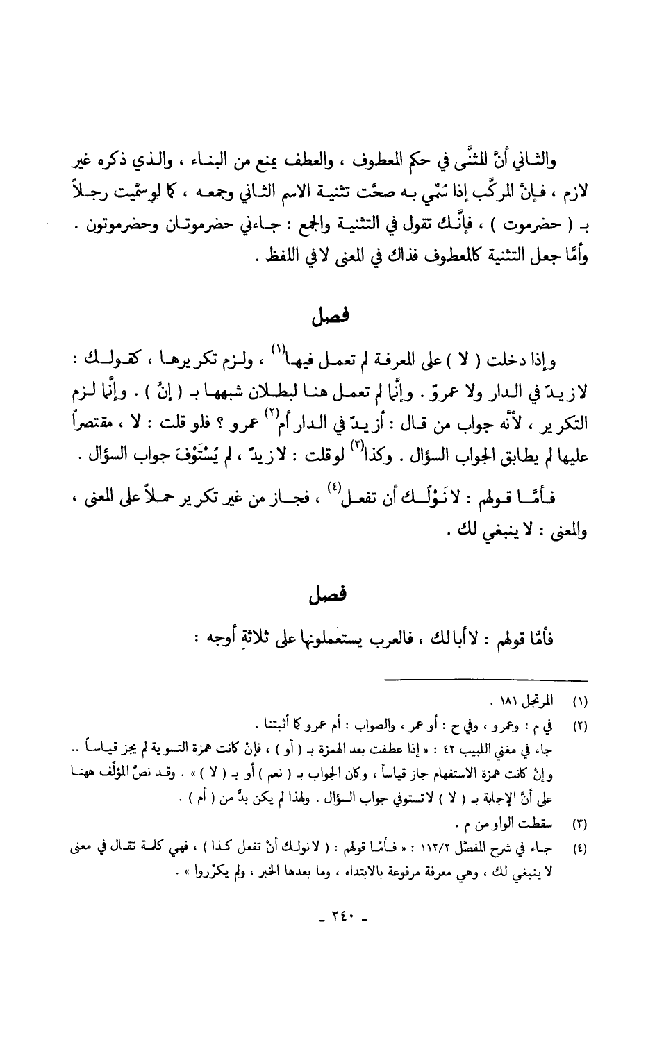 وَإِذا دخلت (لَا) على الْمعرفَة لم تعْمل فِيهَا وَلزِمَ تكريرها كَقَوْلِك لَا زيدٌ فِي الدَّار وَلَا عمروٌ وإنَّما لم تعْمل هُنَا لبُطْلَان شبهها ب (إنّ) وإنَّما لزم التكرير لأنّه جَوَاب من قَالَ أَزِيد فِي الدَّار أم عَمْرو فَلَو قلت لَا مُقْتَصرا عَلَيْهَا لم يُطَابق الْجَواب السُّؤَال وَكَذَا لَو قلت لَا زيدٌ لم يُسْتوف جَوَاب السُّؤَال