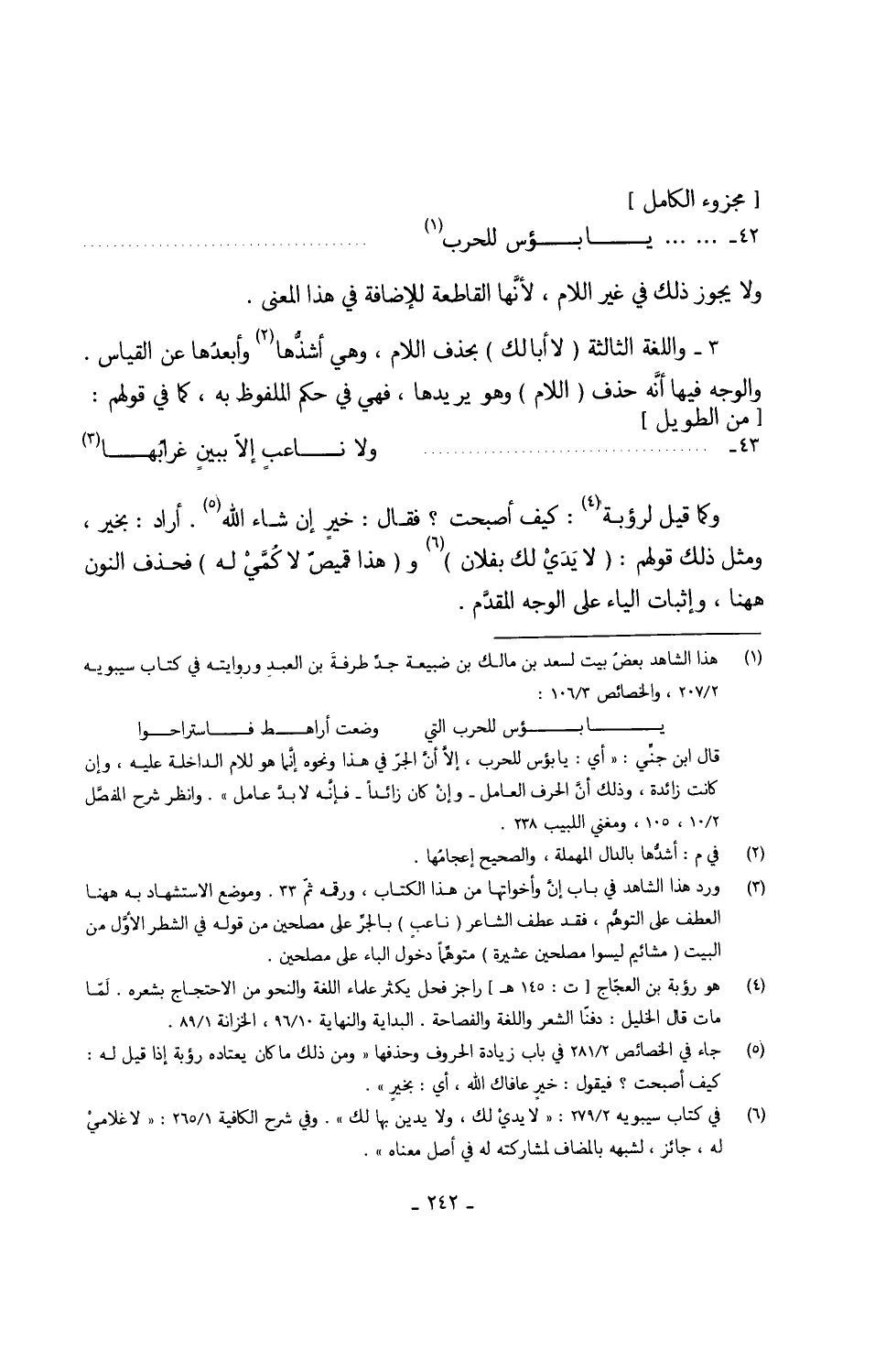 (يابؤس للحرب ... ) // مجزوء الْكَامِل // ولايجوز ذَلِك فِي غير اللَّام لأنَّها القاطعة للإضافة فِي هَذَا الْمَعْنى 3 -