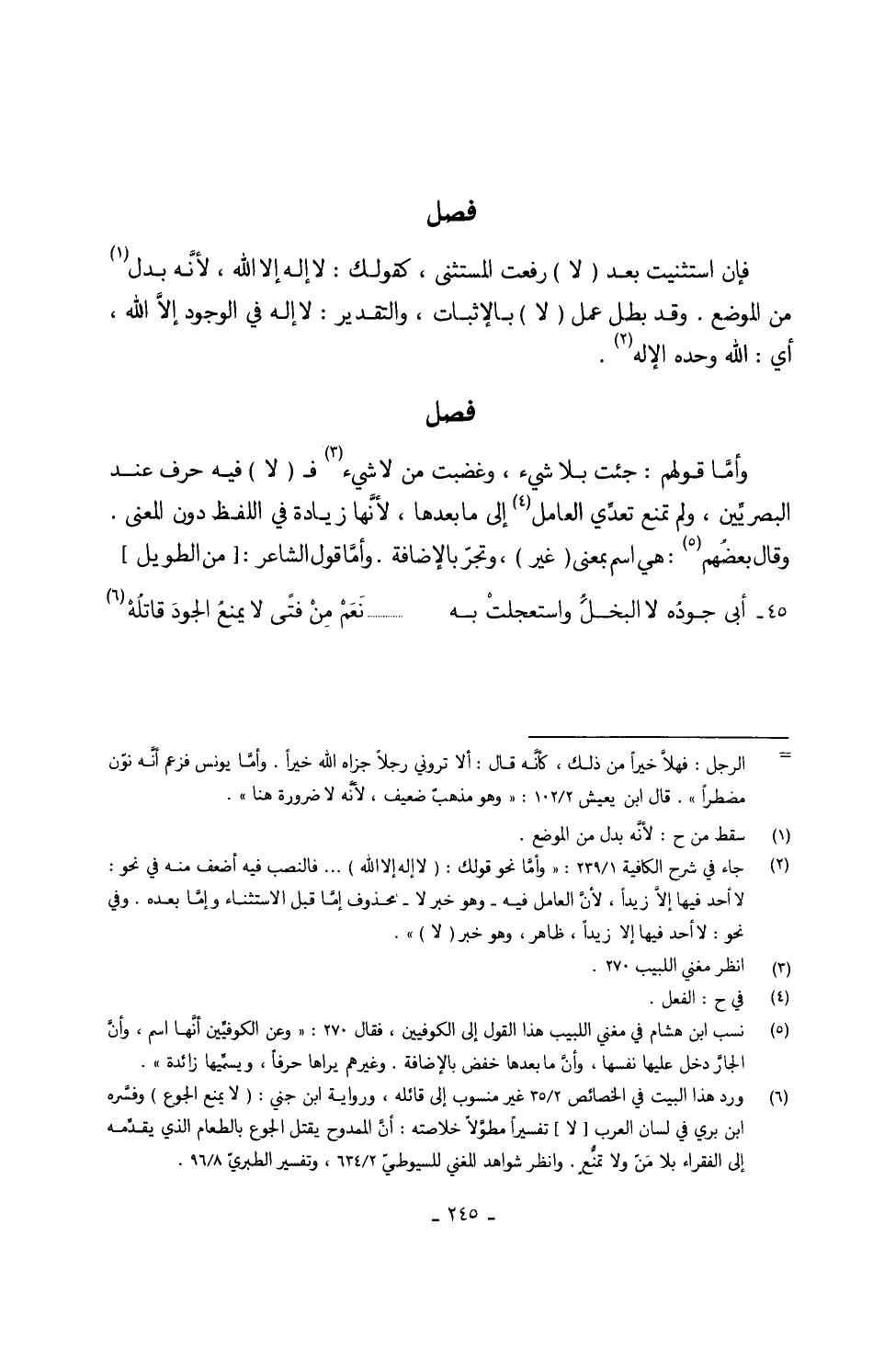 وأمَّا قَوْلهم جِئْت بِلَا شَيْء وغضبت من لَا شَيْء ف (لَا) فِيهِ حرف عِنْد البصريَّين وَلم تمنع تعدِّي الْعَامِل إِلَى مَا بعْدهَا لأنَّها زِيَادَة فِي اللَّفْظ دون الْمَعْنى وَقَالَ بَعضهم هِيَ اسْم بِمَعْنى (غير) وتجرّ بِالْإِضَافَة وأمَّا قَول الشَّاعِر 45 -
