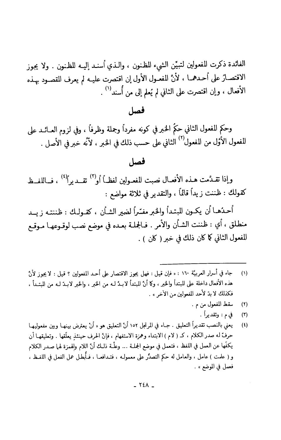 الْفَائِدَة ذكرت المفعولين لتبيِّن الشي المظنون وَالَّذِي أسْند إِلَيْهِ المظنون وَلَا يجوز الاقتصارُعلى أَحدهمَا لِأَن الْمَفْعُول الأول إِن اقتصرت عَلَيْهِ لم يعرف الْمَقْصُود بِهَذِهِ الْأَفْعَال وَإِن اقتصرت على الثَّانِي لم يعلم إِلَى من أسْند