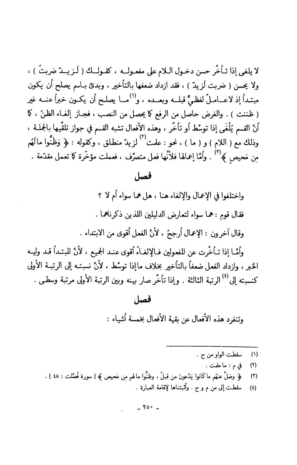 وأمَّا إِذا تأخرَّت عَن المفعولين فالإلغاءُ أقوى عِنْد الْجَمِيع لأنَّ الْمُبْتَدَأ قد وليه الْخَبَر وازداد الْفِعْل ضعفا بالتاخير بِخِلَاف مَا إِذا توسَّط لأنَّ نسبته إِلَى الرُّتْبَة الأولى كنسبة إِلَى الرُّتْبَة الثَّالِثَة وأذا تأخَّر صَار بَينه وَبَين الرُّتْبَة اللرتبة الأولى مرتبَة وسطى