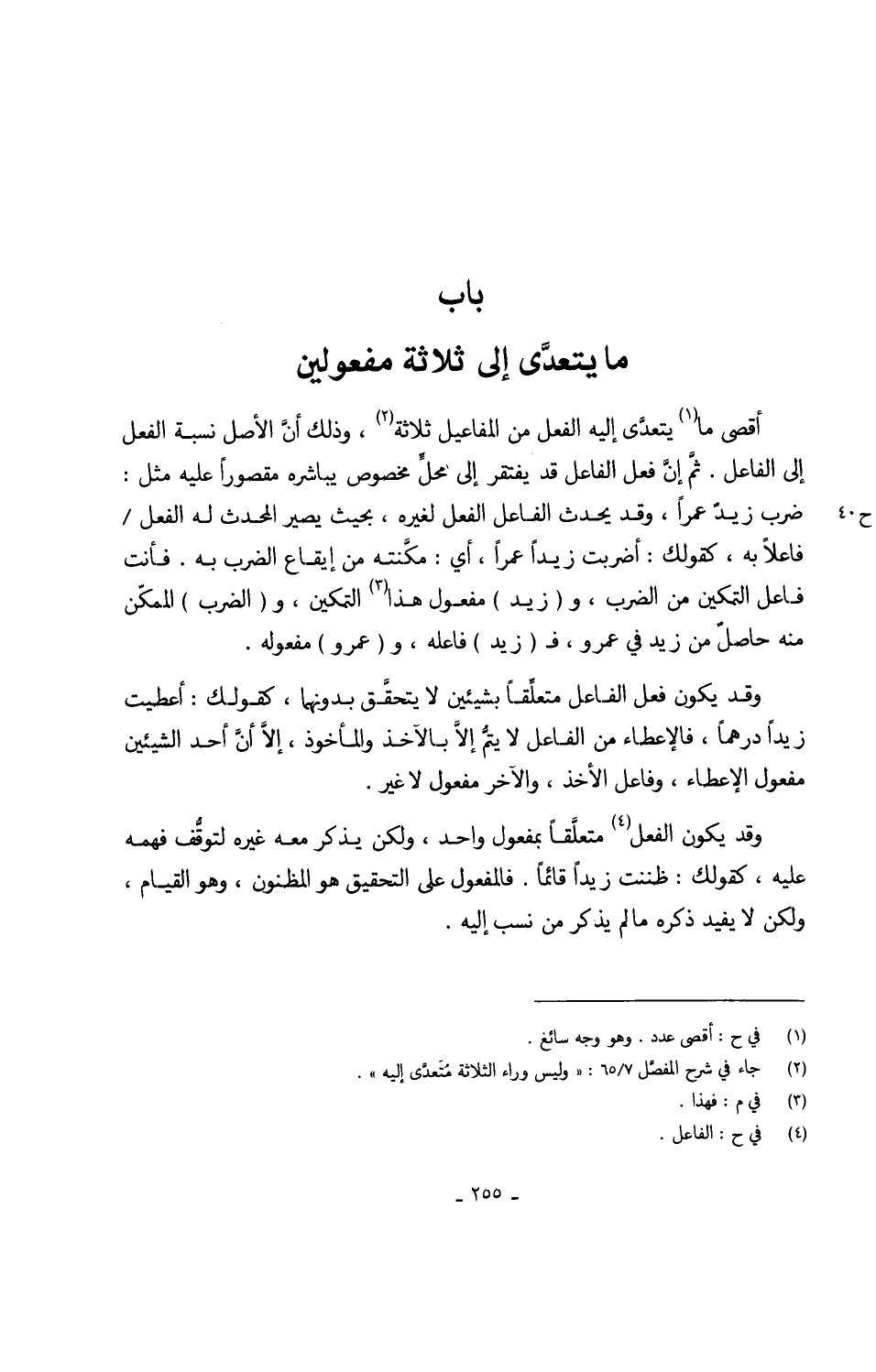أقْصَى مَا يتعدَّى إِلَيْهِ الْفِعْل من الْفَاعِل ثَلَاثَة وَذَلِكَ أنَّ الأَصْل نِسْبَة الْفِعْل إِلَى المفاعيل ثّم إنَّ فعل الْفَاعِل قد يفْتَقر إِلَى محلٍّ مَخْصُوص يباشره مَقْصُورا عَلَيْهِ مثل ضرب زيدٌ عمرا وَقد يحدث الْفَاعِل الْفِعْل لغيره بِحَيْثُ يصير الْمُحدث لَهُ الْفِعْل فَاعِلا بِهِ كَقَوْلِك أضربت زيدا عمرا أَي مكَّنته من إِيقَاع الضَّرْب بِهِ فَأَنت فَاعل التَّمْكِين من الضَّرْب و (زيد) مفعول هَذَا التَّمْكِين و (الضَّرْب) الممكّن مِنْهُ حَاصِل من زيد فِي عَمْرو ف (زيد) فَاعله و (عَمْرو) مَفْعُوله