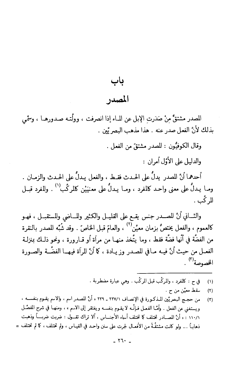وَقَالَ الكوفيُّون الْمصدر مُشْتَقّ من الْفِعْل وَالدَّلِيل على الأول أَمْرَانِ