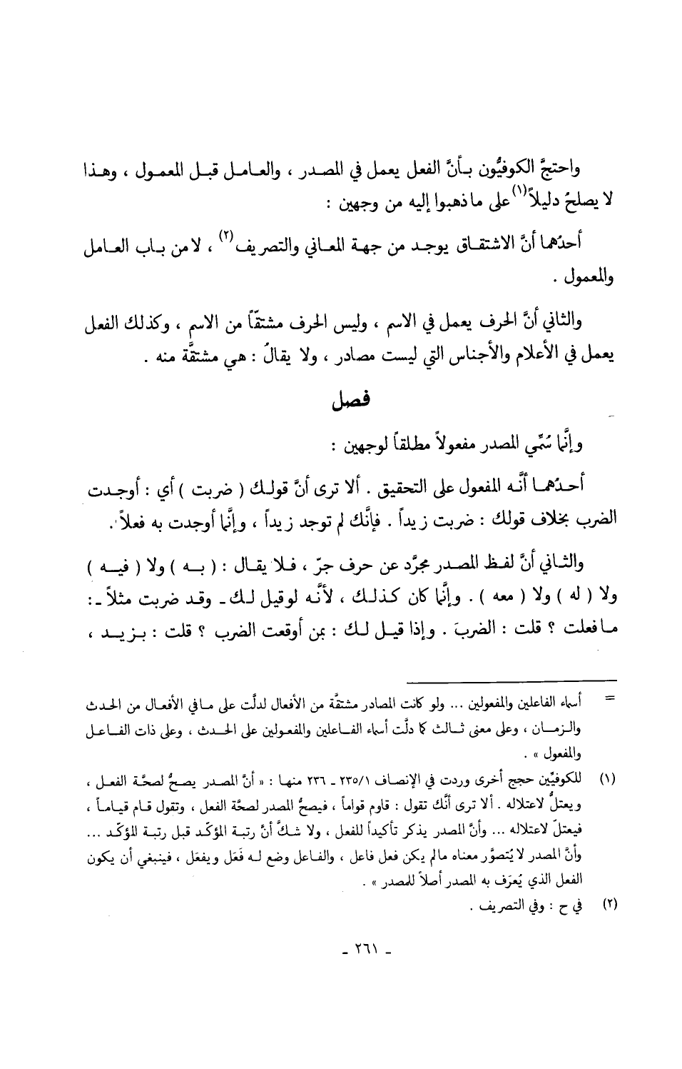 وإنَّما سمّي الْمصدر مَفْعُولا مُطلقًا لوَجْهَيْنِ أَحدهمَا أنَّه الْمَفْعُول على التَّحْقِيق أَلا ترى أنَّ قَوْلك (ضربت) أَي أوجدت الضَّرْب بِخِلَاف قَوْلك ضربت زيدا فَإنَّك لم تُوجد زيدا وإنَّما أوجدت بِهِ فعلا