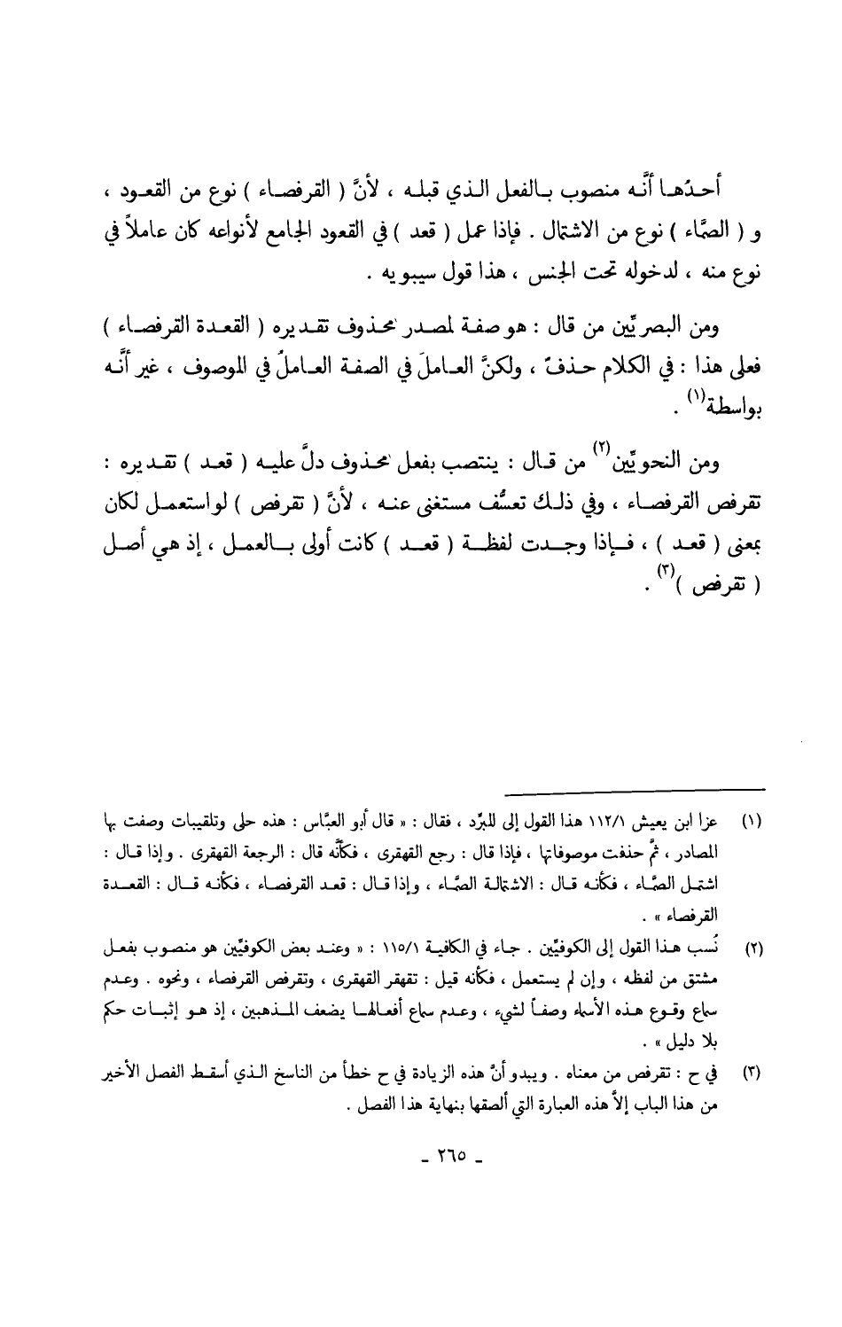 وَمن النحويَّين من قَالَ ينْتَصب بِفعل مَحْذُوف دلَّ عَلَيْهِ (قعد) تَقْدِيره تقرفص القرفصاء وَفِي ذَلِك تعسُّف مُسْتَغْنى عَنهُ لأنَّ (تقرفص) لَو اسْتعْمل لَكَانَ بِمَعْنى (قعد) فَإِذا وجدت لَفْظَة (قعد) كَانَت أولى بِالْعَمَلِ إِذْ هِيَ أصل (تقرفص)