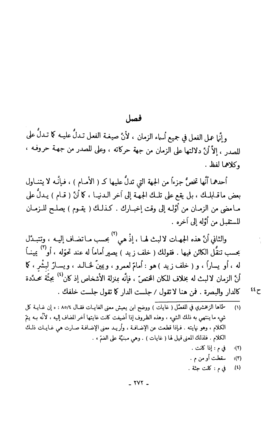 أَحدهمَا أنَّها تخصُّ جُزْءا من الْجِهَة الَّتِي تدلُّ عَلَيْهَا ك (الْأَمَام) فإنَّه لَا يتَنَاوَل بعض مَا قابلك بل يَقع على تِلْكَ الْجِهَة إِلَى آخر الدُّنْيَا كَمَا أنَّ (قَامَ) يدلُّ على مَا مضى من الزَّمَان من أوَّله إِلَى وَقت إخبارك كَذَلِك (يقوم) يصلح للزمان الْمُسْتَقْبل من أوَّله إِلَى آخِره وَالثَّانِي أنَّ هَذِه الْجِهَات لَا لبث لَهَا إذْ هِيَ بِحَسب مَا تُضَاف إِلَيْهِ وتتبدل بِحَسب تنقُّل الْكَائِن فِيهَا فقولك (خلف زيد) يصير أماماً لَهُ عِنْد تحوّله أَو يَمِينا لَهُ أَو يساراً و (خلف زيد) هُوَ أمامٌ لعَمْرو ويمينٌ لخَالِد ويسارٌ لِبِشْرٍ كَمَا أنَّ الزَّمَان لَا لبث لَهُ بِخِلَاف الْمَكَان المختصّ فإنَّه بِمَنْزِلَة الْأَشْخَاص إِذْ كَانَ بجثّة محددة كَالدَّارِ وَالْبَصْرَة فَمن هُنَا لَا تَقول جَلَست الدَّار كَمَا تَقول جَلَست خَلفك